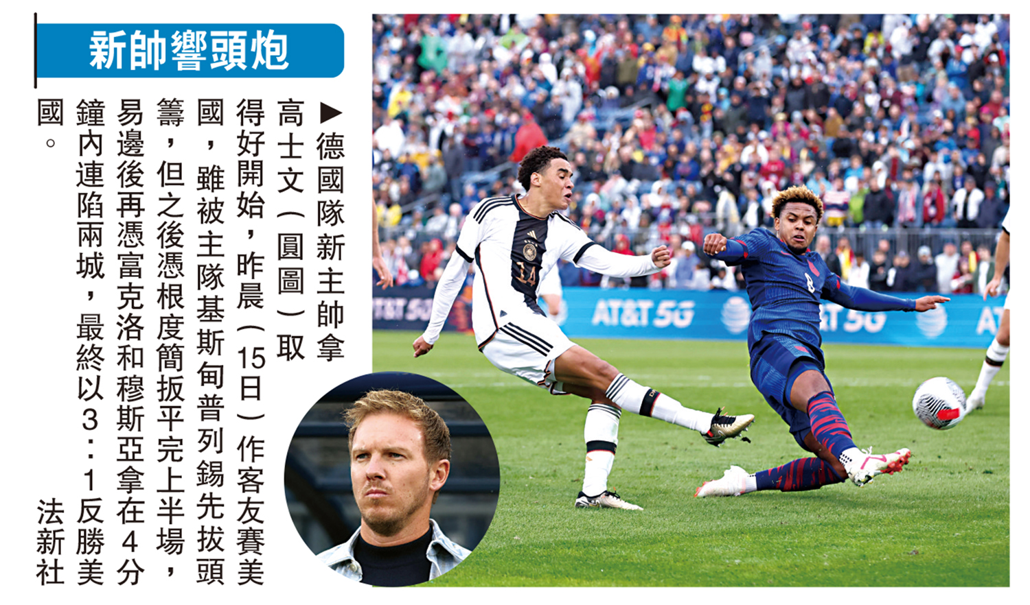 德國隊新主帥拿高士文(圓圖)取得好開始,昨晨(15日)作客友賽美國,雖被主隊基斯甸普列錫先拔頭籌,但之後憑根度簡扳平完上半場,易邊後再憑富克洛和穆斯亞拿在4分鐘內連陷兩城,最終以3:1反勝美國。\法新社