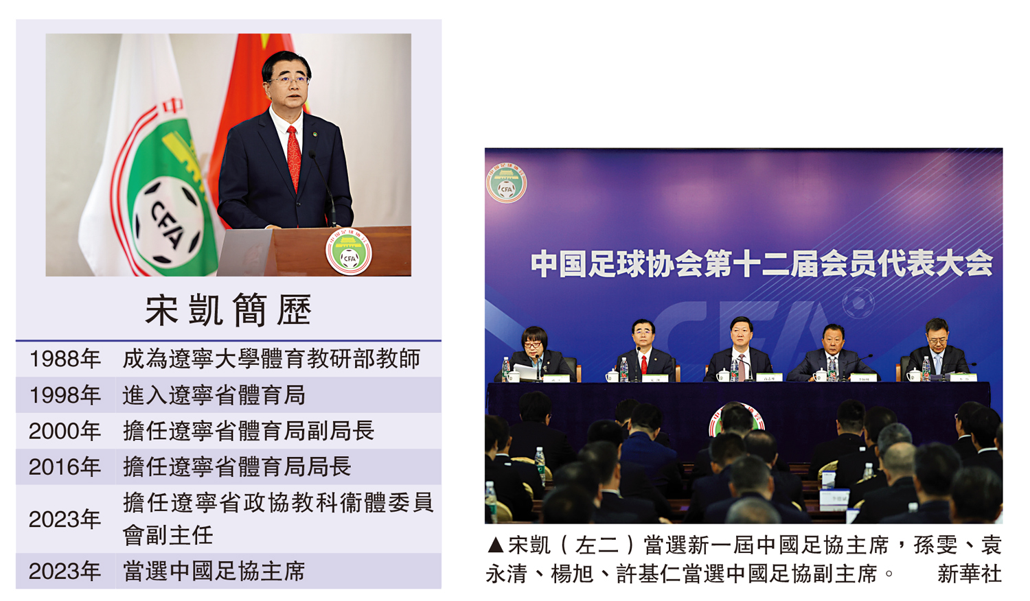 【大公報訊】據中新社報道:中國足協第十二屆會員代表大會16日在北京舉行,選舉產生新一屆執委會和主席、副主席。宋凱當選新一屆中國足協主席,孫雯、袁永清、楊旭、許基仁當選中國足協副主席。
