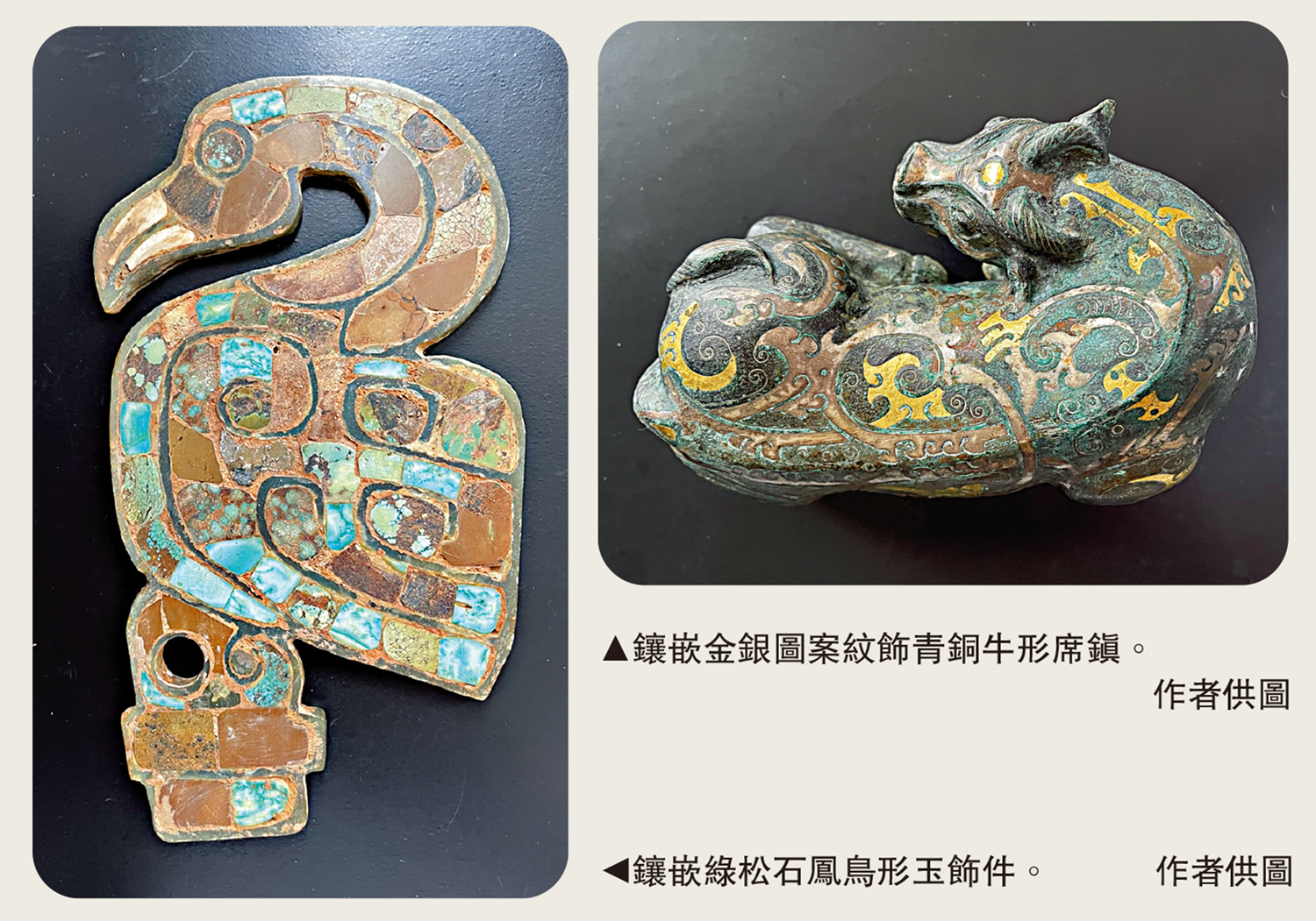 有說法稱我國古時自商周時,中原與西北邊疆民族常有來往,春秋戰國時期接觸更為頻繁,鑲嵌技術是經遊牧民族或商旅為媒介,從中東或印度傳入,看來這是一種推想。鑲嵌綠松石或金銀在青銅器上作為裝飾的藝術技巧,在中原文明的歷史長河是具有承傳的事實,異地傳入迄今未見實證,西來說站不住腳,但互相影響及融合相信是有的。
