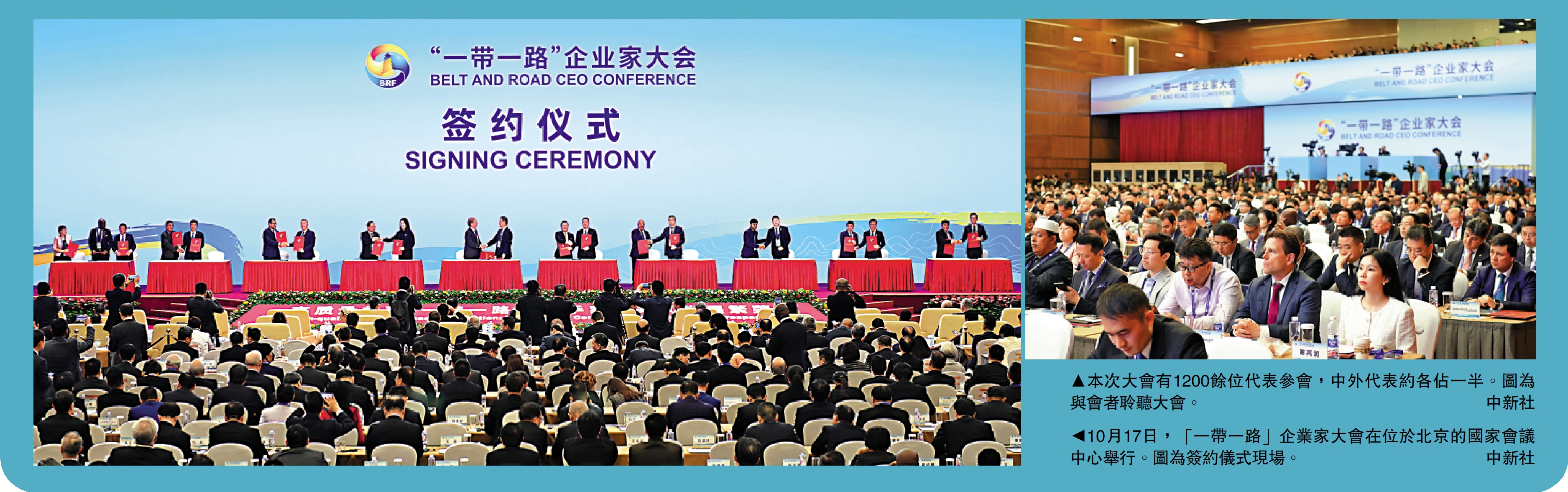 作為第三屆「一帶一路」國際合作高峰論壇的開場活動,「一帶一路」企業家大會10月17日下午在北京國家會議中心舉行。會上發布了《「一帶一路」企業家大會北京宣言》,倡議堅持開放合作、深化互聯互通、堅持綠色發展、推進數字經濟合作以及堅持合規經營和履行社會責任。昨日,並有近300名中外代表在現場簽署合作協議,項目涵蓋基礎設施、清潔能源、人工智能、生物醫藥、金融服務等多個領域,不論是項目數、涉及國別,還是簽約金額,都超過上一屆企業家大會。\大公報記者 張帥北京報道