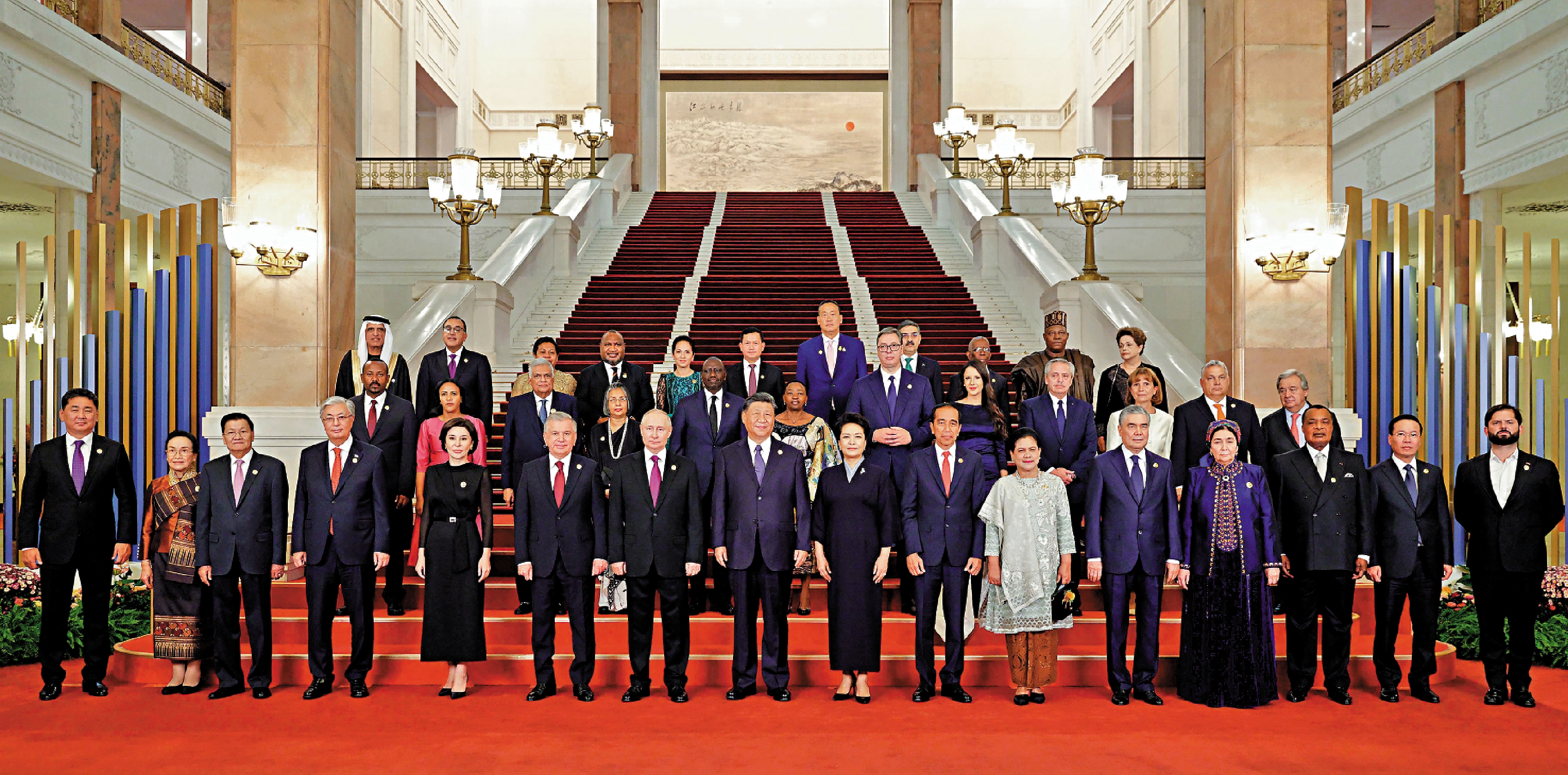 出席高峰論壇的外國國家元首、政府首腦、國際組織負責人等國際貴賓及配偶陸續抵達人民大會堂。禮兵列隊致敬。150多面共建「一帶一路」國家國旗和聯合國旗,整齊分列紅毯兩側,恢宏壯觀。