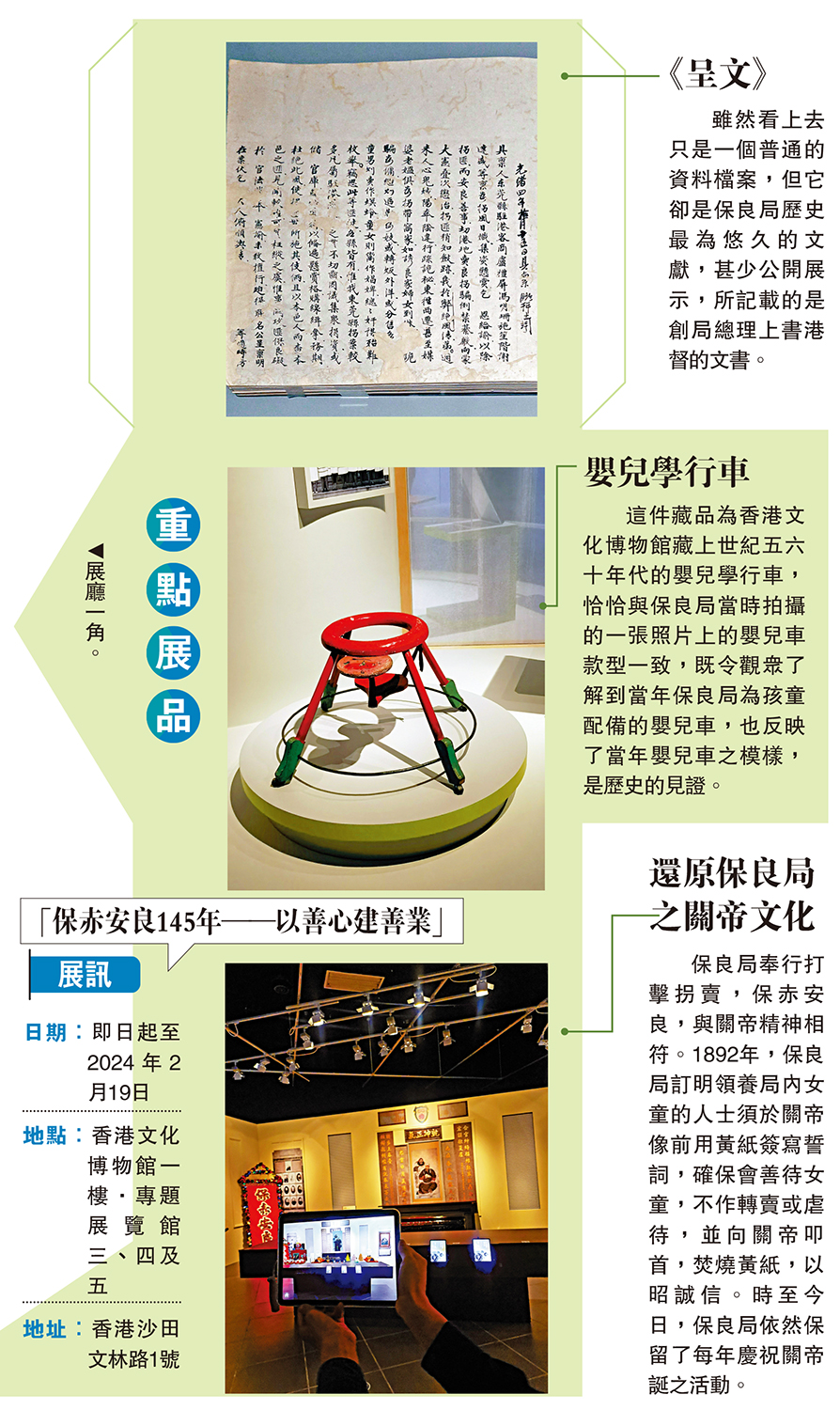 這件藏品為香港文化博物館藏上世紀五六十年代的嬰兒學行車,恰恰與保良局當時拍攝的一張照片上的嬰兒車款型一致,既令觀眾了解到當年保良局為孩童配備的嬰兒車,也反映了當年嬰兒車之模樣,是歷史的見證。
