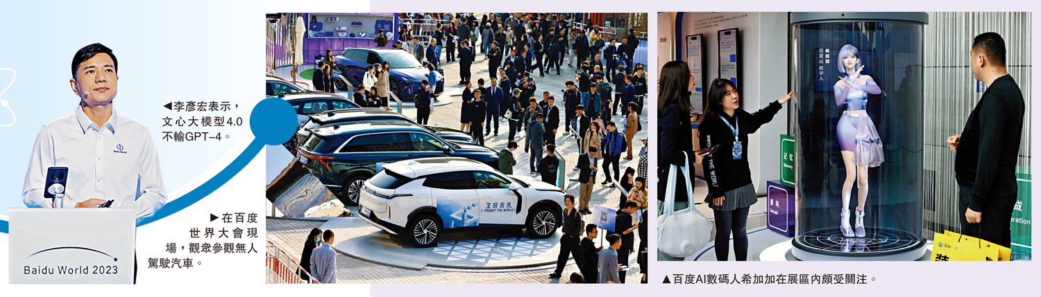 生成式人工智能(AIGC)正在不斷更新迭代,百度(09888)旗下文心大模型亦迎來4.0版本,集團創辦人李彥宏昨日在北京舉辦的百度世界大會上形容,「文心大模型4.0」不比聊天機器人(ChatGPT)的加強版「GPT-4」遜色。他認為,即將進入一個人工智能(AI)原生的時代,進入一個人機通過指令來交互的時代,AI原生應用能夠打開無限的創新空間。\大公報記者 李潔儀