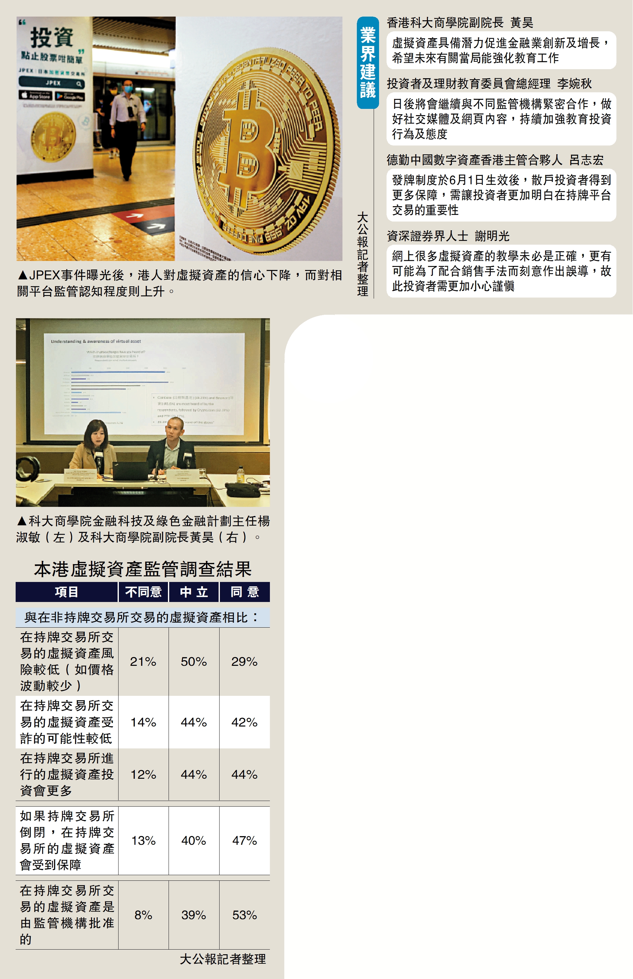 科大商學院副院長黃昊表示,JPEX事件引起大眾對虛擬資產及相關監管事宜的關注外,亦導致相關資產的投資意欲偏向保守,但虛擬資產作為新興資產類別,具備潛力促進金融業創新及增長,但香港及海外市場事件顯示,這類資產亦為投資者和監管機構帶來重大風險及挑戰,故此希望未來能強化相關教育工作,讓公眾更好了解這新興領域的風險及潛力。