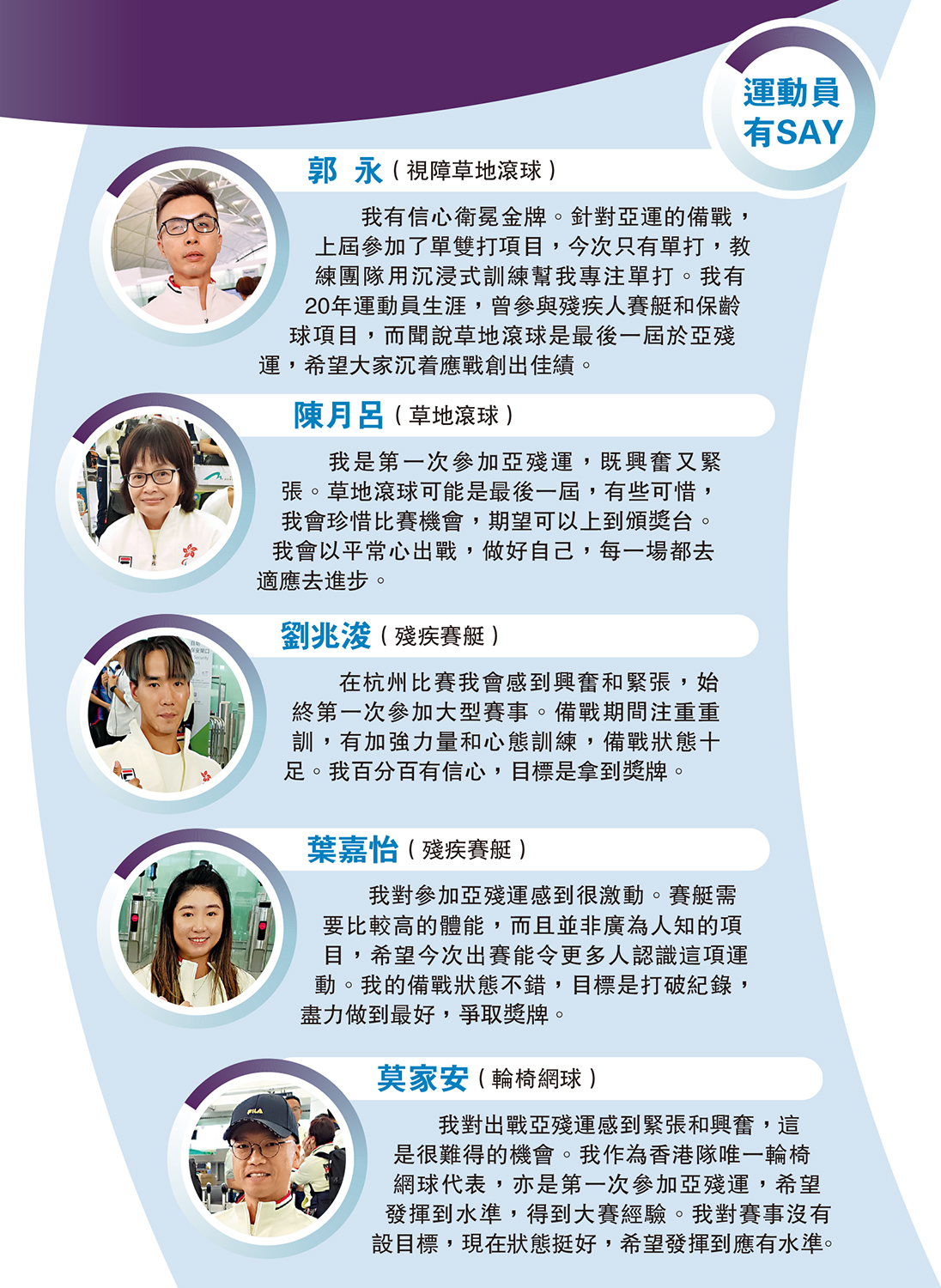 我有信心衛冕金牌。針對亞運的備戰,上屆參加了單雙打項目,今次只有單打,教練團隊用沉浸式訓練幫我專注單打。我有20年運動員生涯,曾參與殘疾人賽艇和保齡球項目,而聞說草地滾球是最後一屆於亞殘運,希望大家沉着應戰創出佳績。