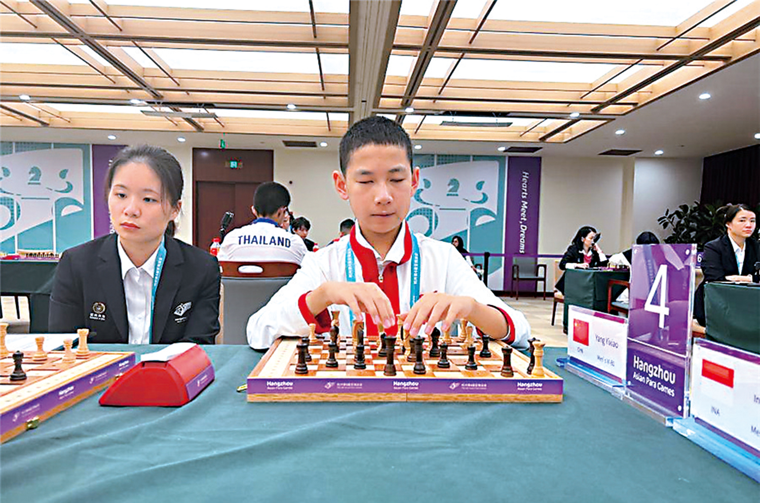 杭州亞殘運中國代表團年齡最小的運動員楊亦瀟只有13歲。23日傍晚,他進行了人生中首場國際級對決─杭州亞殘運國際象棋視力障礙組男子個人賽VI-B1的一場比賽。儘管惜敗於印尼選手,但這位參賽前沒出過遠門的少年,已經跨出了他人生中的一大步。