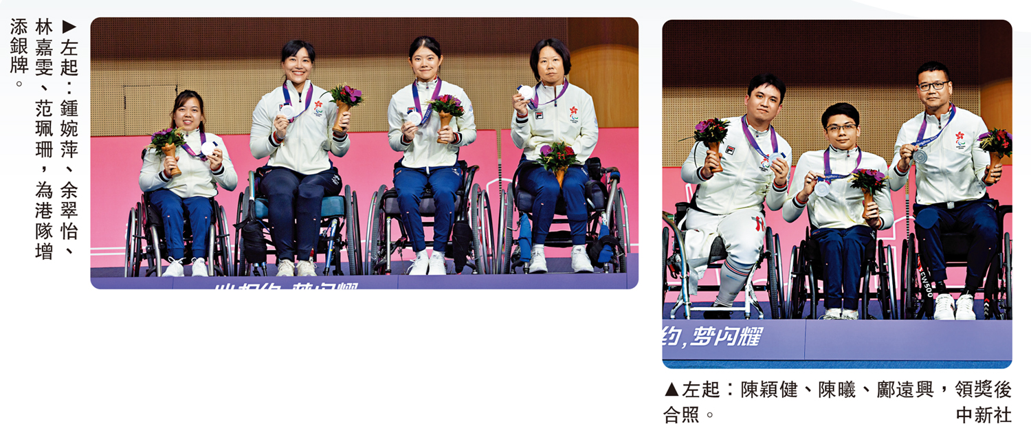 【大公報訊】記者譚德龍報道:杭州亞殘運昨天進行第2日賽事,中國香港代表隊在輪椅劍擊項目上增添兩枚銀牌。由「六朝元老」余翠怡領銜的女子花劍隊在團體賽決賽不敵國家隊,連續兩屆拿下銀牌;男子佩劍隊則於團體賽決賽奮力追趕下,惜仍然負於泰國,為港隊取得銀牌。