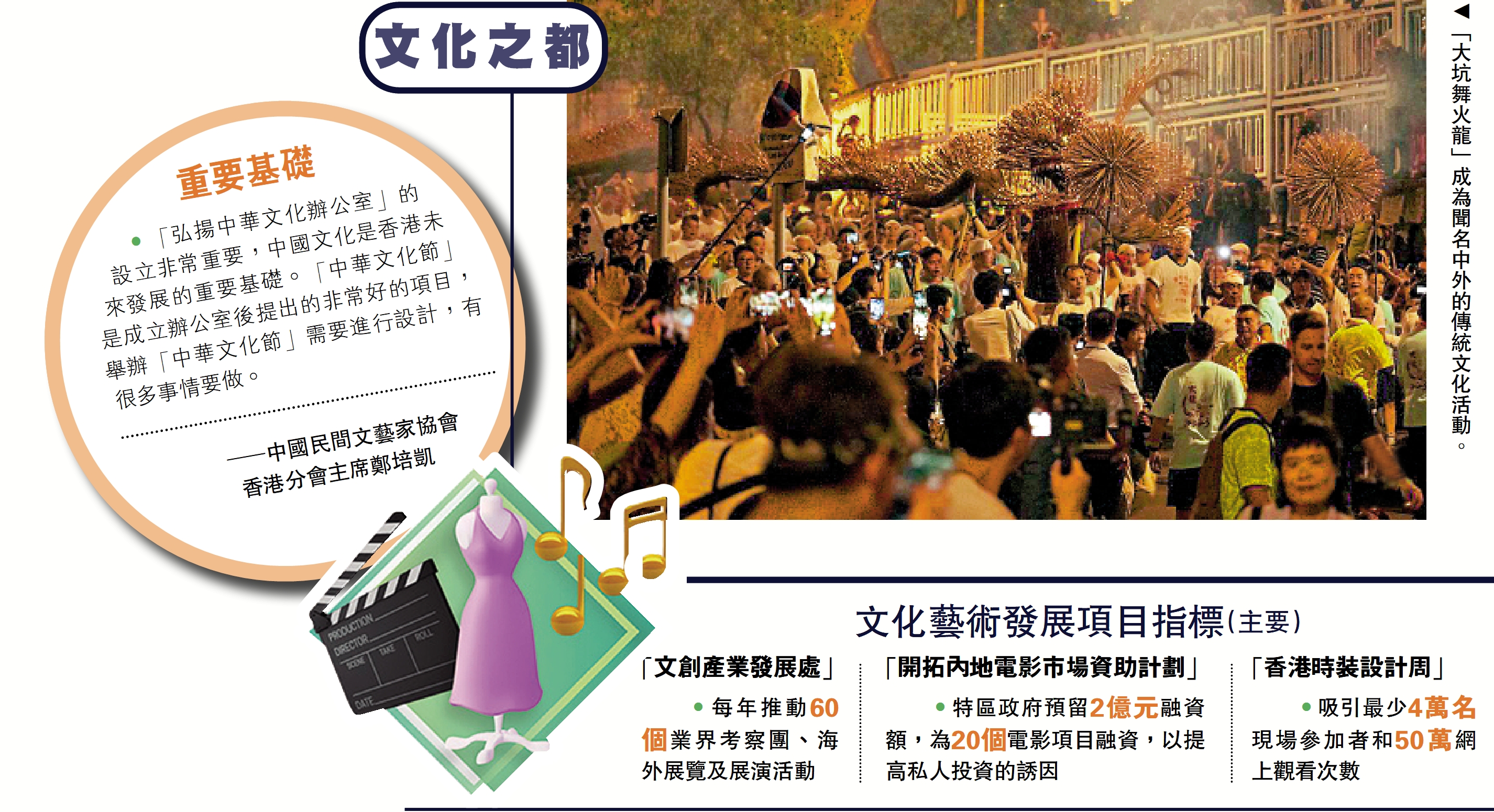 行政長官李家超在昨日發表任期內的第二份施政報告。他表示香港將成立「弘揚中華文化辦公室」,舉辦「中華文化節」,並設立兩所博物館介紹國家和抗戰歷史。特區政府將全力推動文化創意產業的發展,文化體育及旅遊局今年內將公布和推展《文藝創意產業發展藍圖》,亦會為「電影發展基金」和「創意智優計劃」共注資港幣43億元,提供誘因吸引私人市場資金,拓展新市場。\大公報記者 顏 琨