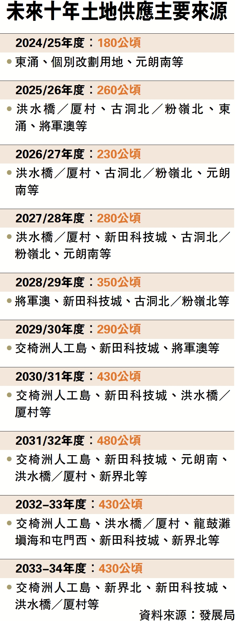 2025/26年度:260公頃\•洪水橋/厦村、古洞北/粉嶺北、東涌、將軍澳等