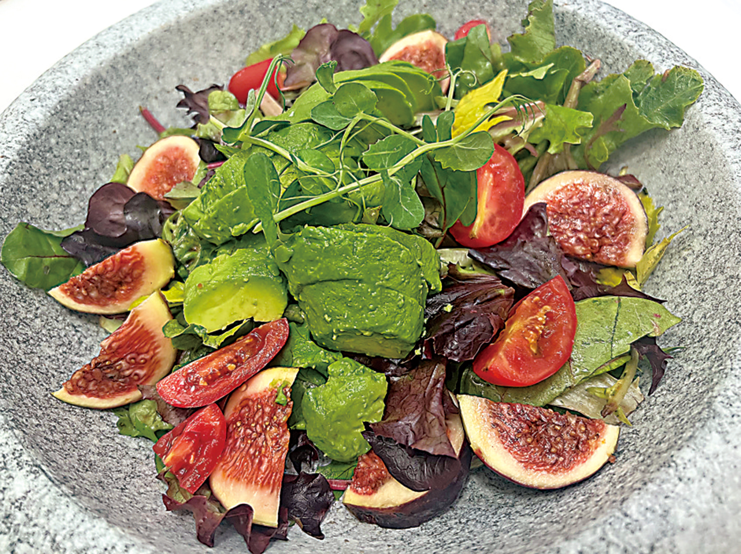 我點了「無花果牛油果沙律」,分量充足,水果及沙律菜均非常新鮮甜美,醬汁是意式油醋,開胃健康。廚師將顏色鮮明的食物放於淡灰色石紋盤中,擺盤絕不馬虎,拍照十分漂亮,是心水的打卡之選。