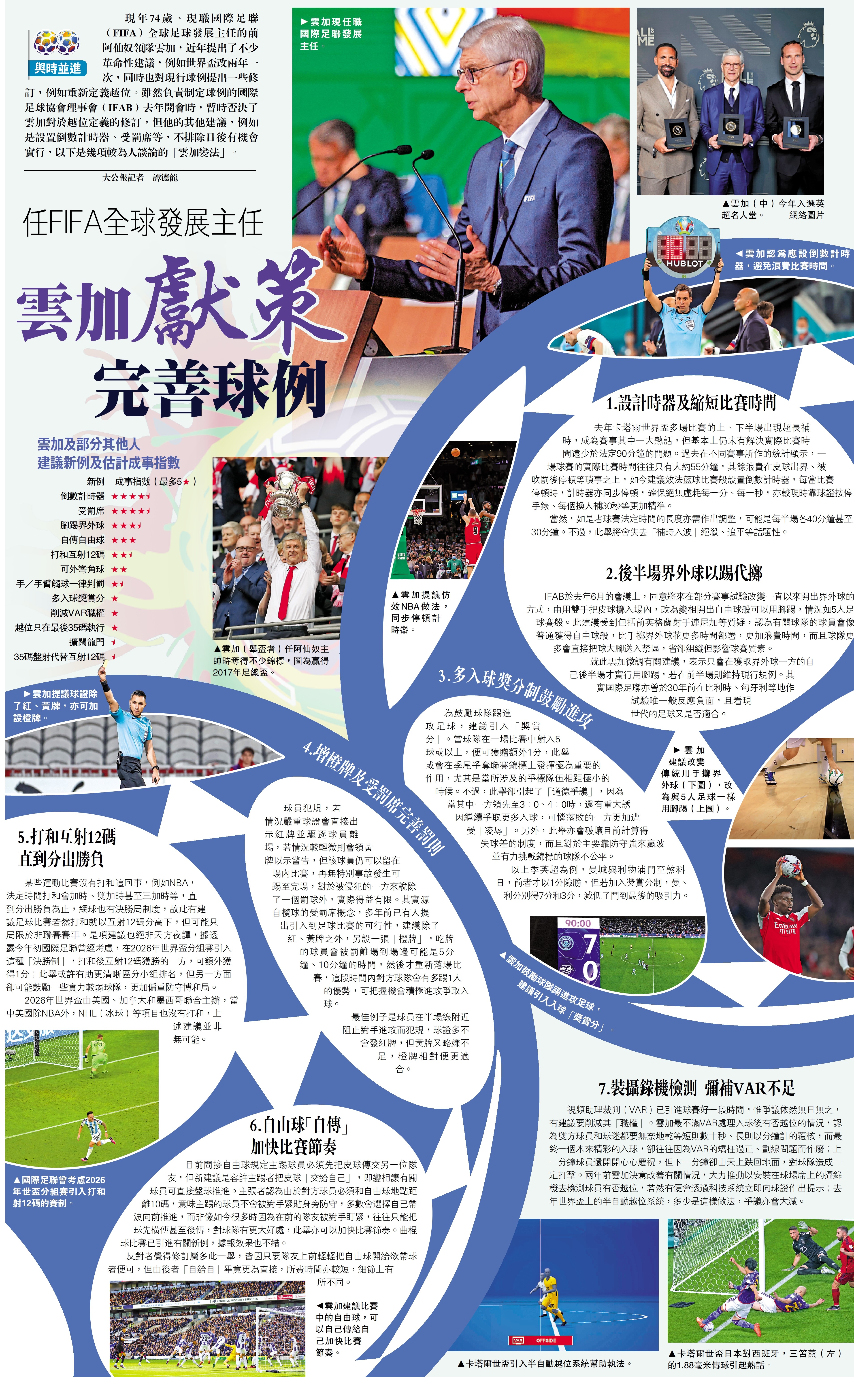 現年74歲、現職國際足聯(FIFA)全球足球發展主任的前阿仙奴領隊雲加,近年提出了不少革命性建議,例如世界盃改兩年一次,同時也對現行球例提出一些修訂,例如重新定義越位。雖然負責制定球例的國際足球協會理事會(IFAB)去年開會時,暫時否決了雲加對於越位定義的修訂,但他的其他建議,例如是設置倒數計時器、受罰席等,不排除日後有機會實行,以下是幾項較為人談論的「雲加變法」。\大公報記者 譚德龍