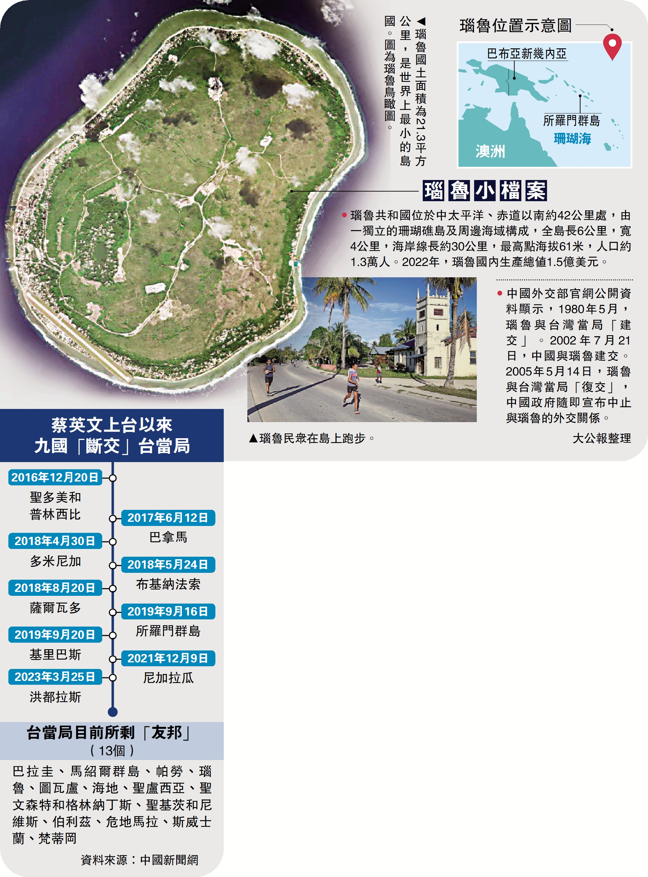 北京科技大學學者溫天鵬向大公報表示,太平洋島國瑙魯「親台」總統下台,勢必衝擊到該國與台灣的所謂「邦交關係」。長期以來,台灣當局勞民傷財採用「金元外交」的方式鞏固所謂「邦誼」,瑙魯與台灣關係就是一個典型案例,此種行徑早已被國際社會頻頻戳穿。事實上,台灣目前所能維持的「友邦」幾乎背後都有美國因素的影響,但隨着美國在這些區域影響力的持續衰弱,台灣能維持的所謂「友邦」也將會所剩無幾,與大陸建交將會是不可阻擋的歷史大勢。相信瑙魯的新總統會逐漸認清這一趨勢,不再和台灣沆瀣一氣,回到一個中國原則的正確道路上來。