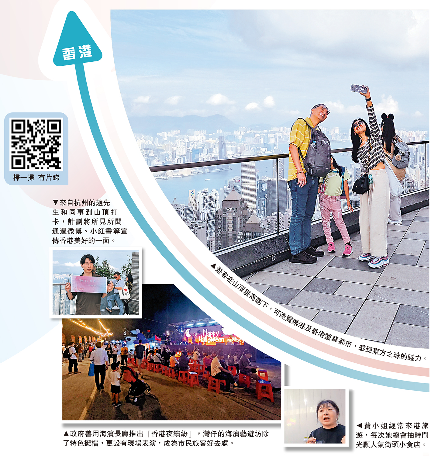有深圳旅客表示,內地年輕人不再鍾情買名牌手袋,而是喜歡發掘特色小店、在街角打卡,以至我們認為平常不過的雙層巴士,在旅客眼中都是旅遊體驗。有一年來港十次八次的廣州旅客,鍾情香港的地道小食如雞蛋仔、魚蛋及各式放題。在高鐵帶動下,粵港大灣區實現一小時生活圈,有廣州旅客即興乘搭高鐵來到西九站,只為嘆一杯香港地道的絲襪奶茶。\大公報記者 伍軒沛、黃山、盛德文、蘇荣 (文、圖、視頻)