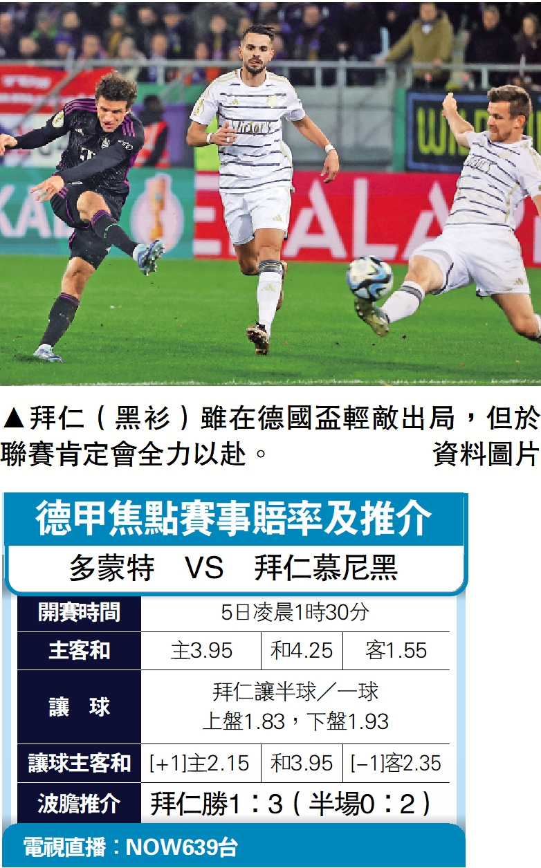 【大公報訊】綜合sportsmole、香港賽馬會足智彩報道:「德甲打吡」大戰首循環明晨上演,由多蒙特主場迎撼拜仁慕尼黑。拜仁剛於德國盃意外出局,聯賽暫時又落後於利華古遜,在射手哈利卡尼復出下必化悲憤為力量誓擒主隊,「讓球」拜仁讓半/一,值博上盤。(NOW639台明晨1時30分直播)