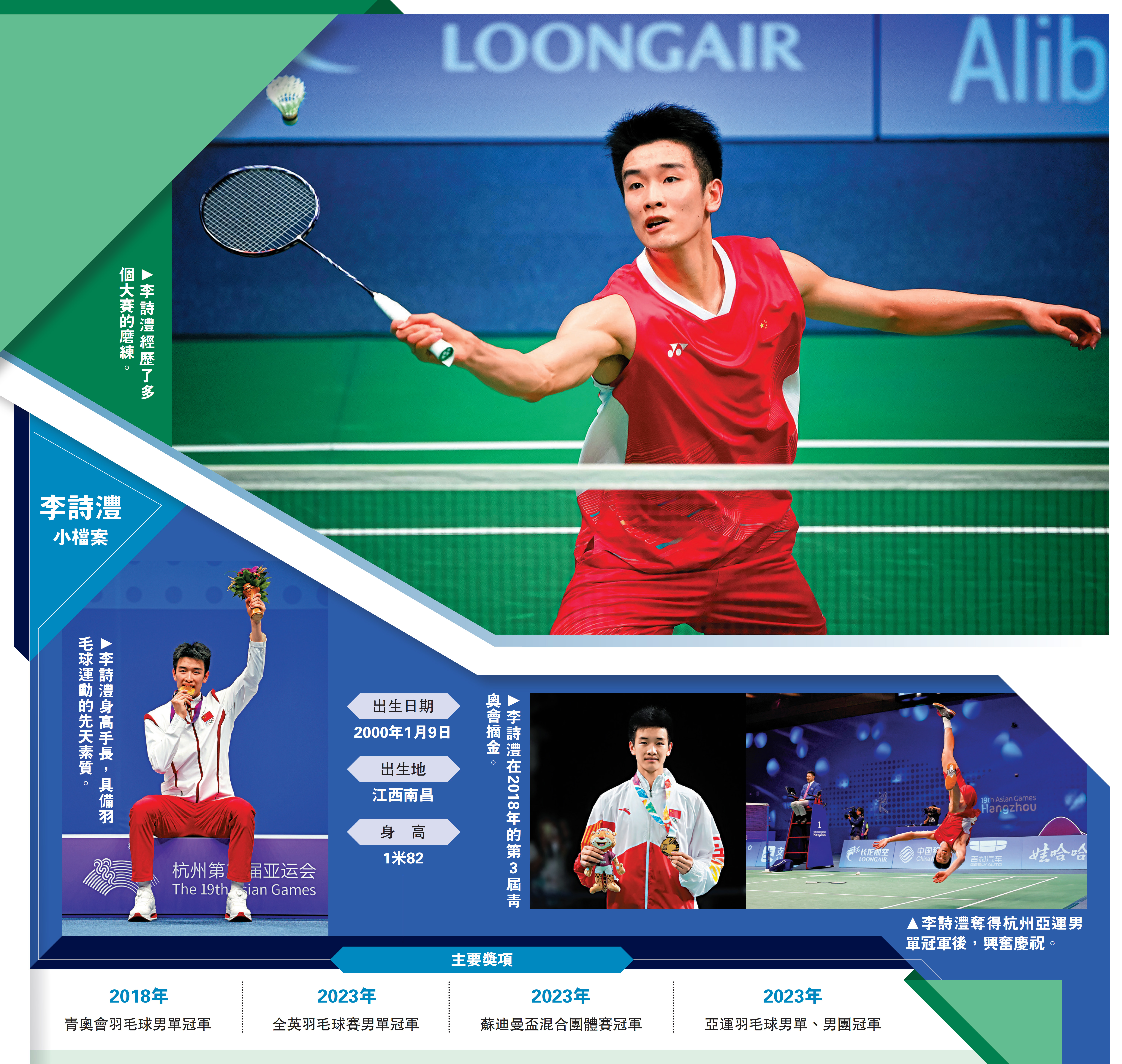 經過了2022賽季世界羽壇各項大賽的磨煉,李詩灃在2023賽季迎來了爆發。今年全英公開賽上,賽前並非大熱的他一路連勝伍家朗、趙軍鵬、黃志勇、安東森等名將,並在決賽中完勝隊友石宇奇奪得冠軍,這是他職業生涯中首次獲得超級1000公開賽冠軍。在杭州亞運羽毛球男團決賽中,國家隊一度大比分0:2落後印度,擔任第2單打的李詩灃在絕境中顯示出了超出年齡的冷靜與智慧,最終擊敗曾排名世界第1的印度名將斯里坎特,成為中國男隊決賽逆風翻盤的最大功臣。隨後在男單項目上,李詩灃又一路連勝西本拳太、金廷、普蘭諾伊、石宇奇等名將,以未失一局的驕人成績奪得了分量極重的亞運男單冠軍,成為新世紀以來繼林丹之後,第2位獲得亞運男單冠軍的中國選手。
