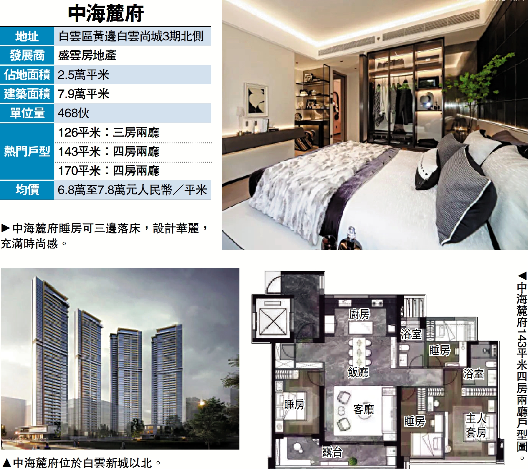 中海麓府樓高40至44層,每幢兩梯三戶布局,戶戶向東南,望向白雲山,風景優美。項目提供3款戶型,分別為126平米三房兩廳,以及143平米和170平米四房兩廳,入場費約800萬元(人民幣,下同)(約855萬港元),每平米均價6.8萬至7.8萬元,與周邊樓盤相若。