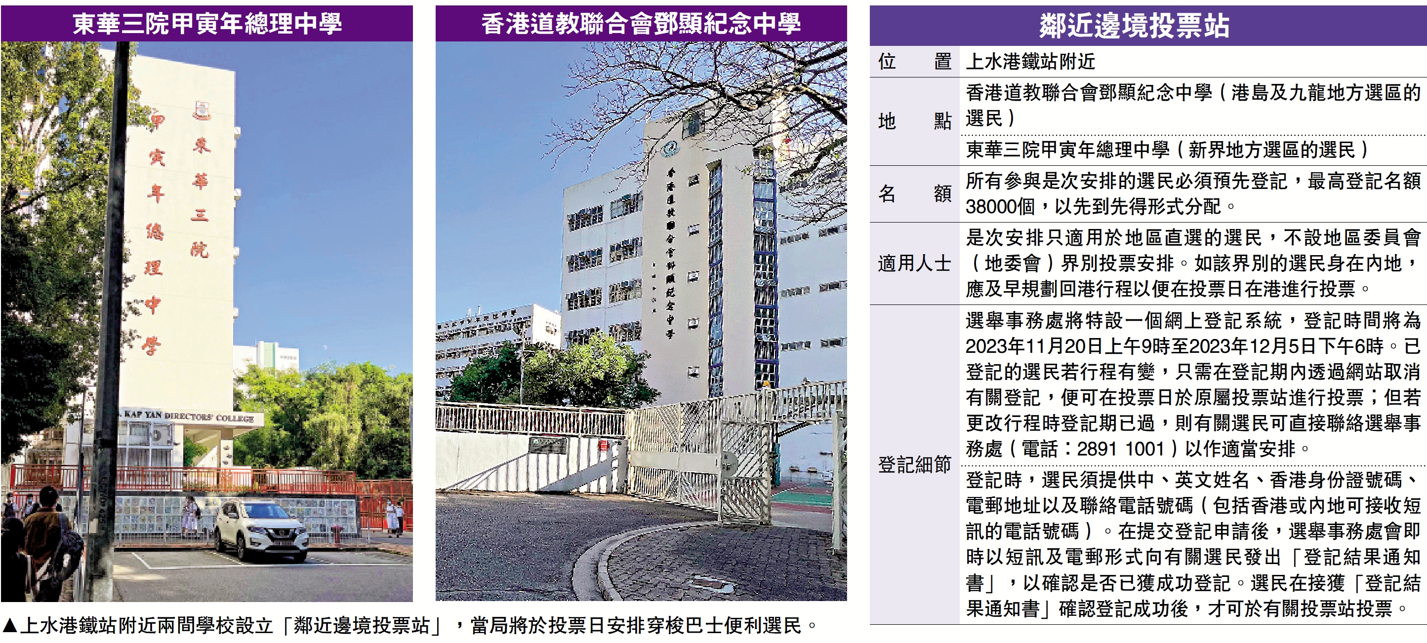 政府昨日公布,將在12月10日區議會選舉當日在上水港鐵站附近的兩間學校設立「鄰近邊境投票站」,便利在內地的選民返港投票。「鄰近邊境投票站」的最高登記名額為3.8萬個,名額將以先到先得形式分配。為確保有關安排有序進行,所有參與是次安排的選民必須預先登記。網絡登記系統將於11月20日開始運作。