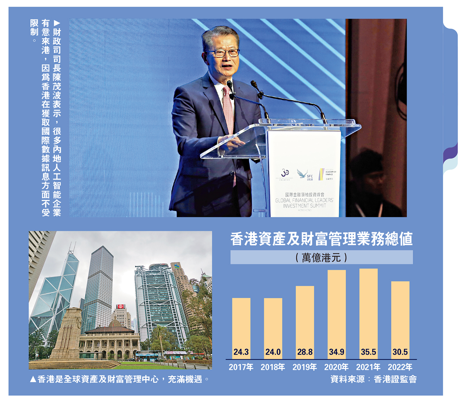 自全面通關復常後,香港加快與大灣區其他城市融合,但數據未能打通一直是一大挑戰。財政司司長陳茂波在國際金融領袖投資峰會上表示,香港在中央的支持下,正積極推動粵港澳大灣區內的跨境數據流通,指數據融合將有利於人工智能(AI)、醫藥及生命科技等創新產業發展。\大公報記者 邵淑芬(文) 何嘉駿(圖)