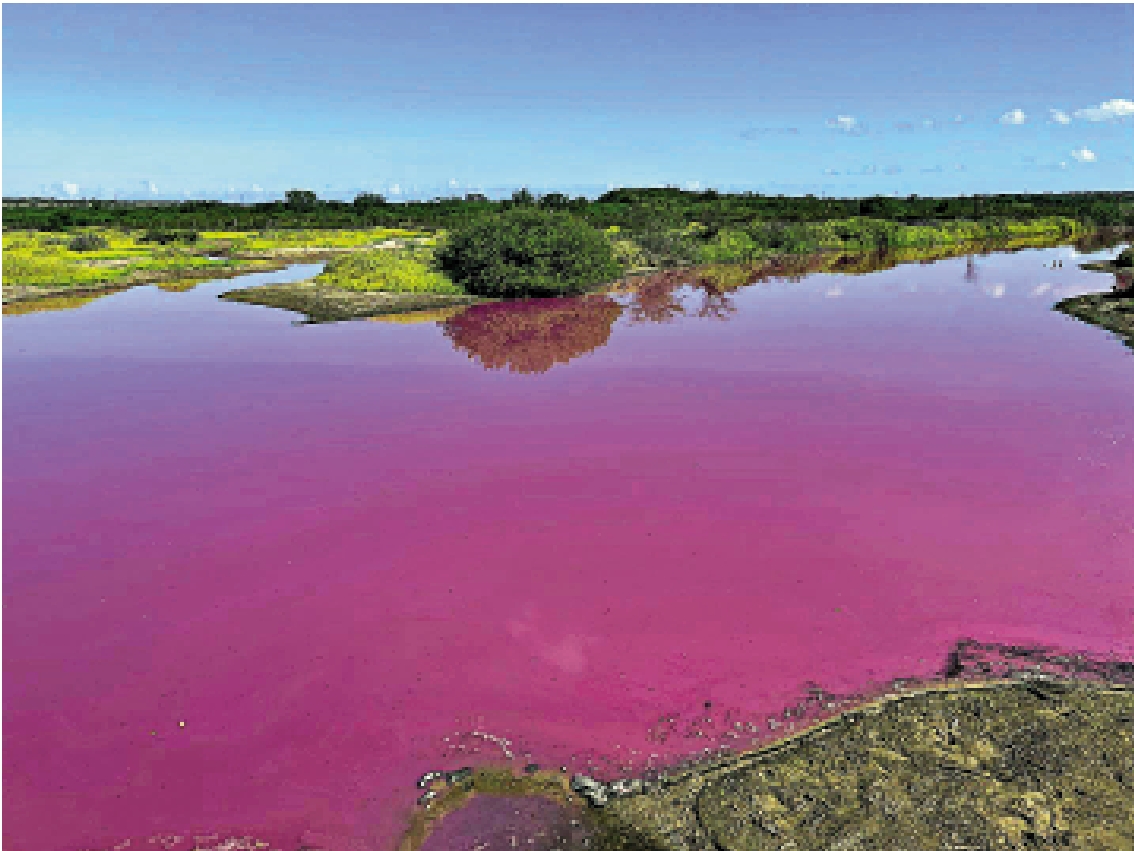 由於氣候乾旱造成水位過低,美國夏威夷毛伊島一處池塘的鹽度升高至海水的兩倍,導致大量嗜鹽的細菌在水中繁殖,使得整個池塘變成一片稀奇又神秘的粉紫色。