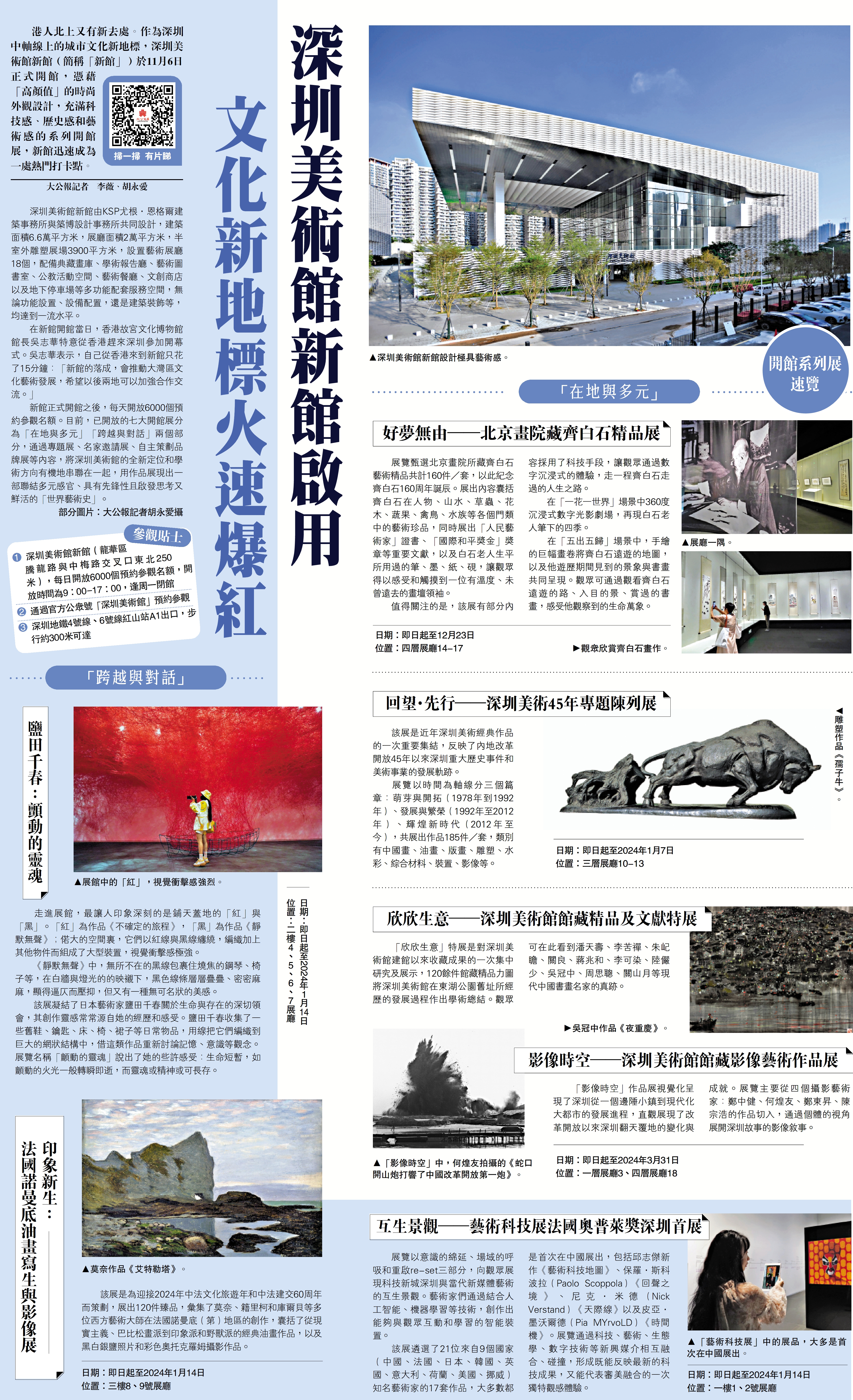港人北上又有新去處。作為深圳中軸線上的城市文化新地標,深圳美術館新館(簡稱「新館」)於11月6日正式開館,憑藉「高顏值」的時尚外觀設計,充滿科技感、歷史感和藝術感的系列開館展,新館迅速成為一處熱門打卡點。\大公報記者 李薇、胡永愛