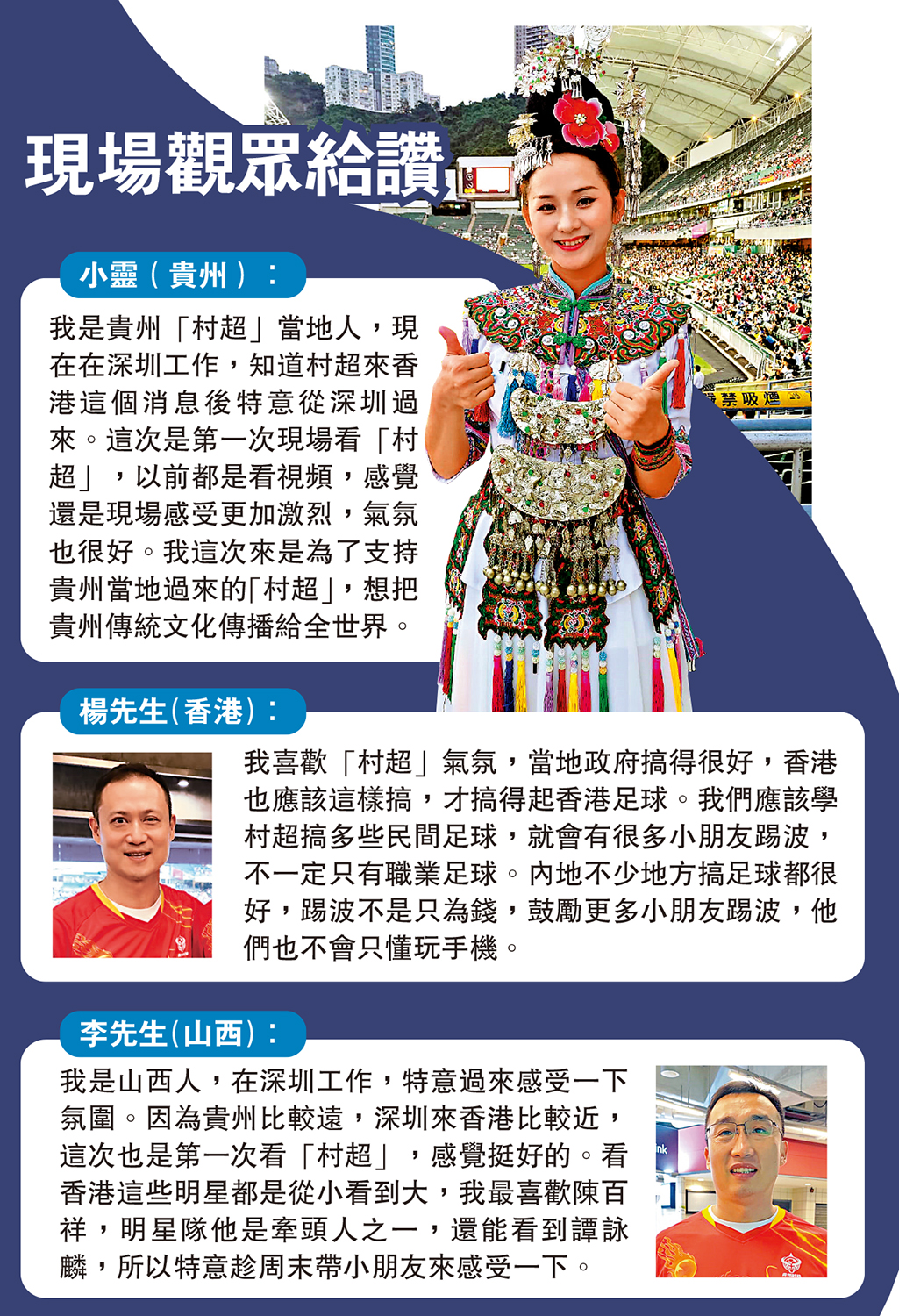 我喜歡「村超」氣氛,當地政府搞得很好,香港也應該這樣搞,才搞得起香港足球。我們應該學村超搞多些民間足球,就會有很多小朋友踢波,不一定只有職業足球。內地不少地方搞足球都很好,踢波不是只為錢,鼓勵更多小朋友踢波,他們也不會只懂玩手機。