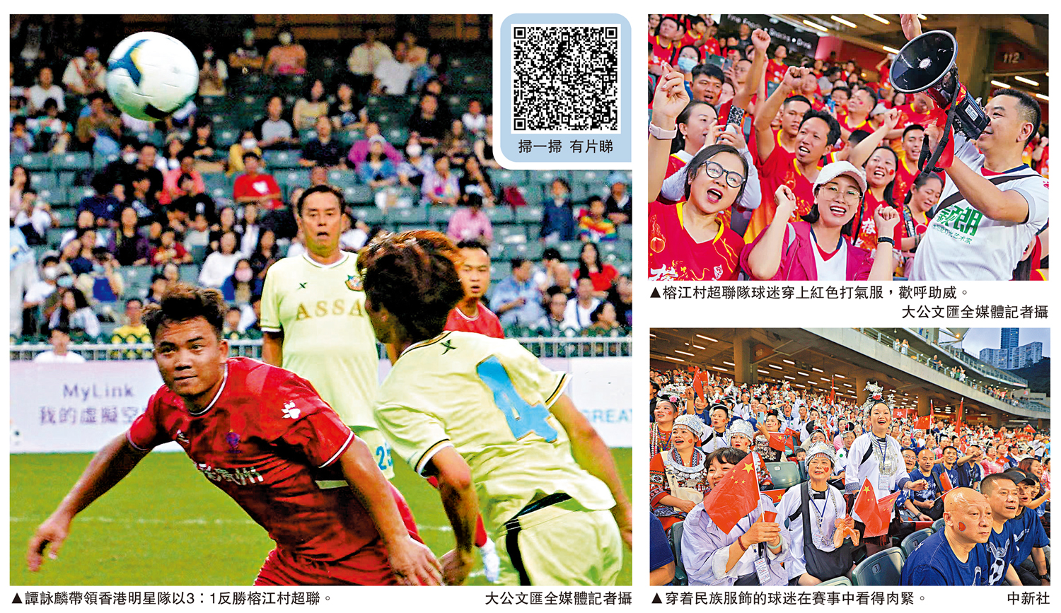 「香港明星足球隊×榕江村超聯隊」足球邀請賽2023昨天(11日)於香港大球場圓滿舉行,香港明星足球隊最終以3:1戰勝村超聯隊,勝出這場友誼賽。昨天這一場不單是足球賽事的技術切磋,還有村超聯隊為香港市民帶來貴州特色的文藝表演,而香港明星足球隊成員及知名歌手亦獻唱不少膾炙人口港劇金曲,體現兩地交流的熱切,整場賽事變成足球和文化交流的嘉年華。\大公報記者 張銳