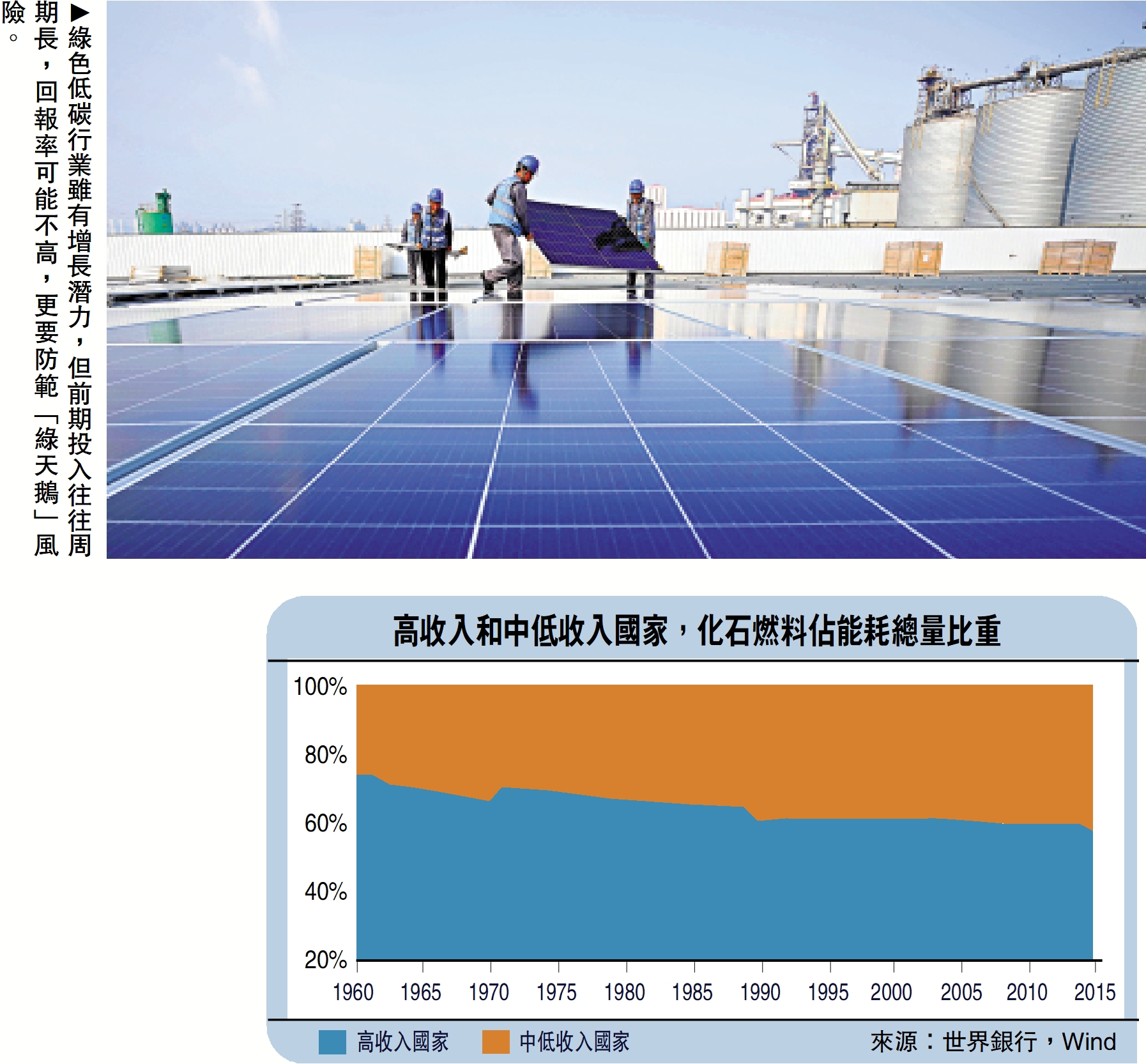 研究估算,2021-2060年中國綠色投資平均缺口的區間值在2.5-3.5萬億元(人民幣,下同)左右。面對大規模的綠色低碳轉型,需要考慮兩個現實議題:其一,不同國家和地區在經濟增長模式上存在巨大差異,具體產業類型、能源結構、對外依存度等,全球應對氣候變化行動的一致性與區域差異的不一致性存在衝突。世界銀行統計,1980年高收入和中等收入國家的化石燃料佔能耗總量的比重分別為94.43%、44.2%,到2015年的比重分別為79.08%、88.96%。全球綠色低碳轉型以及投資需要考慮宏觀經濟增長範式的異質性,這將涉及到綠色低碳投資的國際責任分配和金融資源配置。