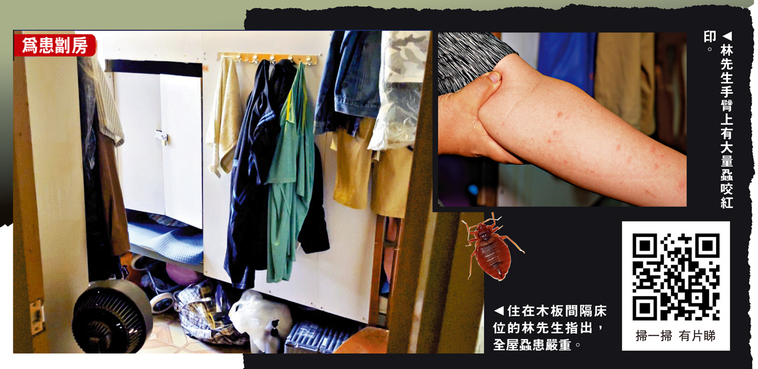 兩年多以來住在長沙灣僅一人身位闊的木板床位,林先生表示,他與其他住客均日夜飽受床蝨侵擾之苦,「在這住多久就被蝨咬多久,幾乎每晚都睡得不好,影響了工作。」雖入冬後床蝨相對不活躍,惟他每晚睡覺時仍被蝨叮咬手腳,床蝨有時會從衣物鑽進後背,愈用手搔反而愈癢,所以要每日搽類固醇藥膏紓緩痕癢。
