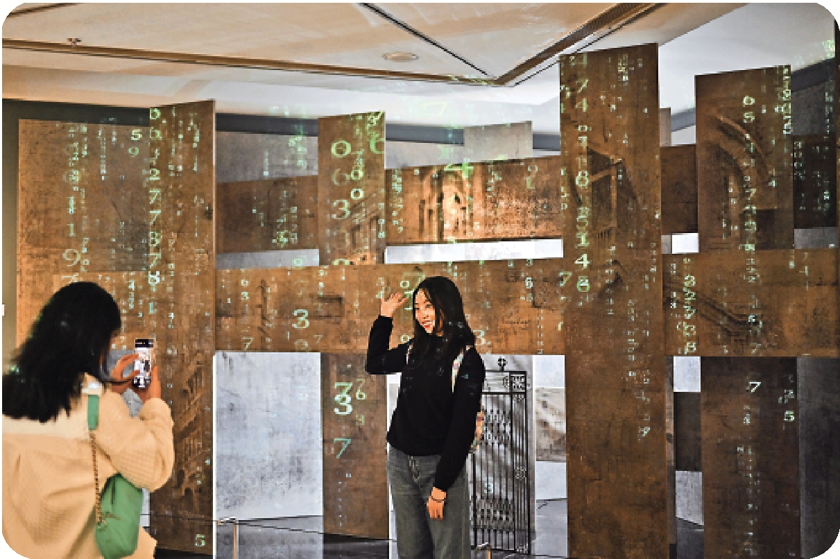 圖:《永不消逝的電波》裝置吸引參觀者。\中新社