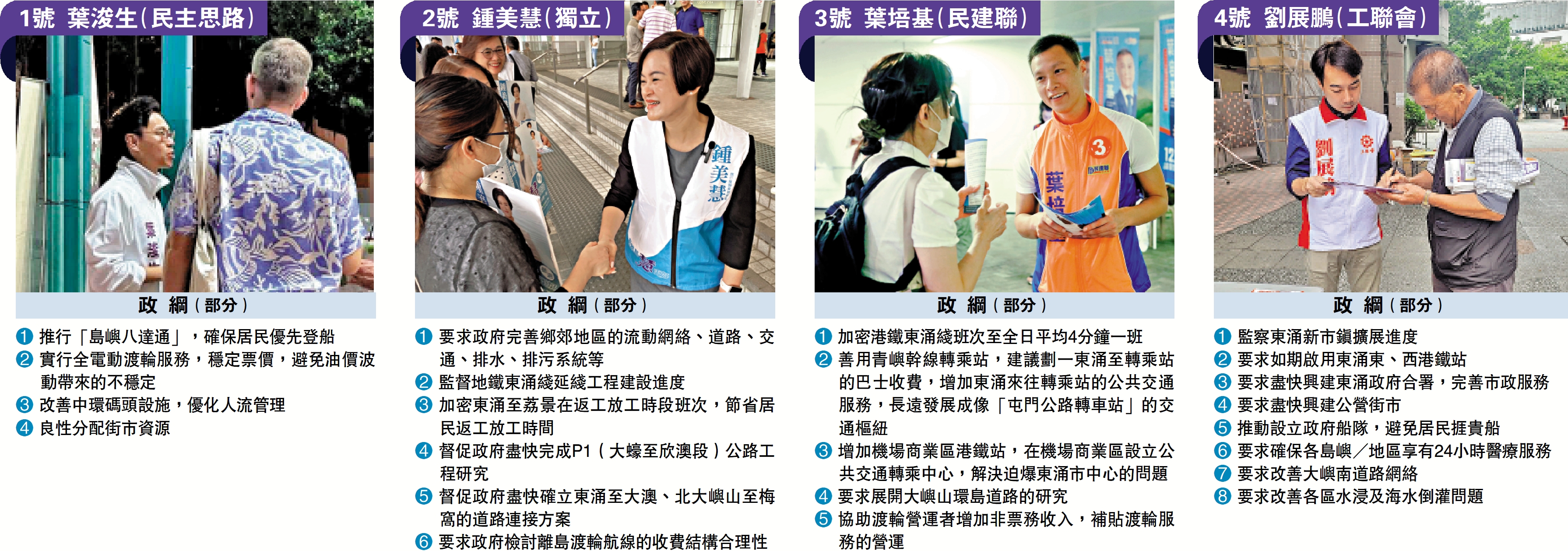 離島區在全港十八區中佔地最廣,但人口最少。近年來,一些主要島嶼發展迅速,尤其是東涌新市鎮增長顯著。本次四名參加區議會離島地區直選的候選人擁有不同背景,但都植根離島。候選人關注區內旅遊業的發展與居民需求的平衡,亦關注部分島嶼交通、醫療、供水、供電不便等問題,希望通過政府、社區、社會各界等多方合作,改善區內民生。\大公報記者 黃釔淼、李天源