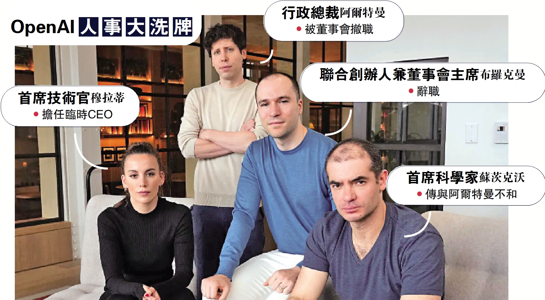 蘇茨克沃擔心快速擴張和商業化,影響產品的長期安全性,他在今年7月組建了一個管控人工智能的新團隊,卻在一個月前被削權,這反映了他與阿爾特曼等人的摩擦。蘇茨克沃後來向董事會投訴,贏得了某些成員的支持。