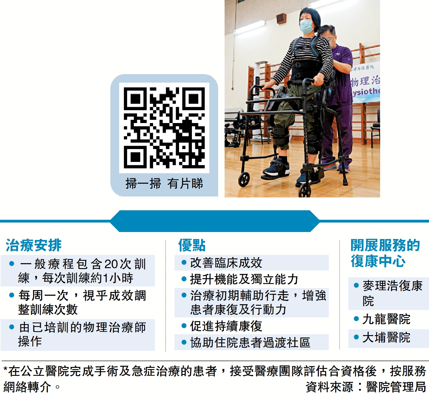 醫管局表示,明年全面評估接受「機械腳」治療患者康復成果,研究進一步擴展服務。目前專職醫療診所首次診症收費135元,其後每次80元。