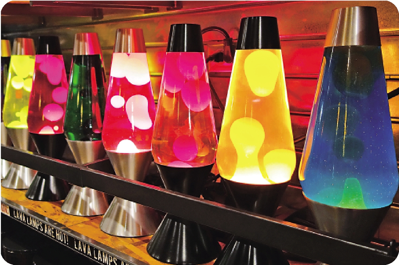 就像很多成功的發明一樣,熔岩燈的問世非常偶然,創意是在酒吧裏產生的。英國會計師出身的企業家愛德華·沃克,一九六三年在英格蘭漢普郡一家酒吧的爐子上,看到自製的雞蛋定時器,這是由一個裝有液體的玻璃雞尾酒調酒器製成的裝置,當雞蛋完成時,它有漂浮在表面的蠟塊,於是他萌生了製作熔岩燈的想法。燈的製作原理並不複雜,按美國作家尼爾·沃爾什在《與神對話》一書中描述,關燈時,在透明的油質層之下有一層紅色的黏性半流體物質。開燈時,底部的燈絲將其加熱,這層紅色半流體受熱膨脹,密度因此降低,開始以延展的塊狀上升到油層頂部。一旦充分冷卻,它又下沉回原位。如此周而復始,造成變化的光影效果,而那些形狀的變化是無窮無盡的,那個反覆展開的過程叫人看了入迷。