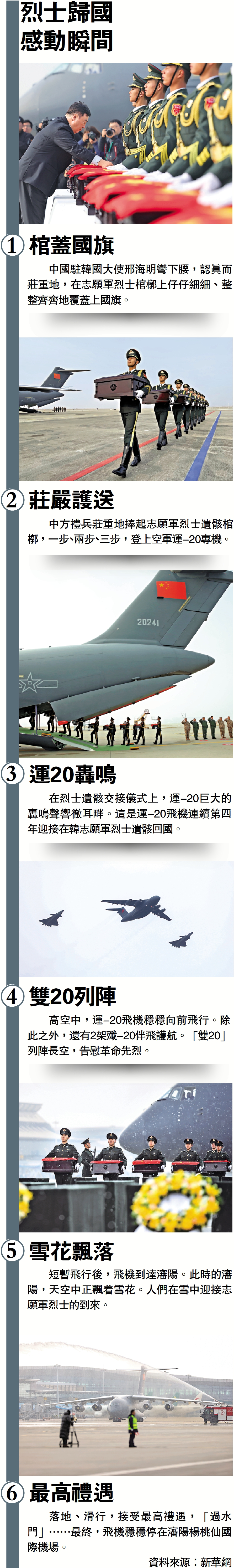 中方禮兵莊重地捧起志願軍烈士遺骸棺槨,一步、兩步、三步,登上空軍運-20專機。