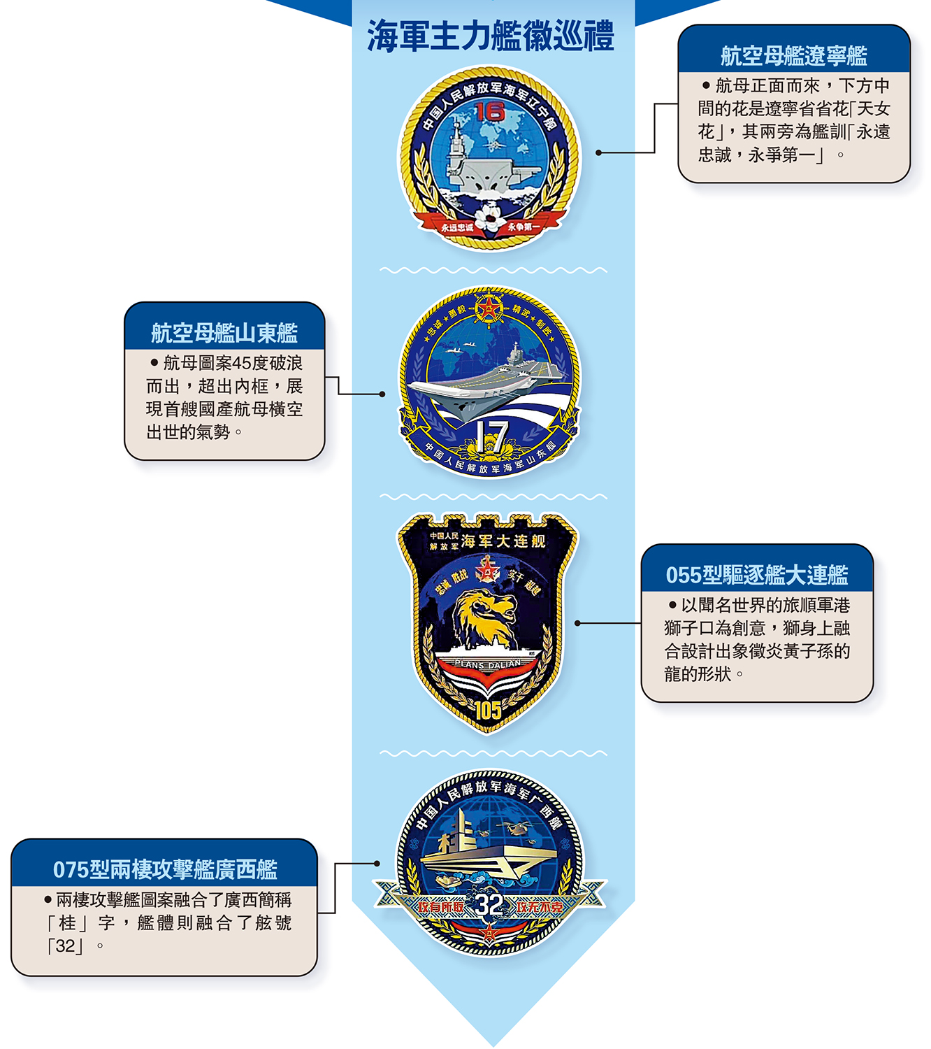 •航母圖案45度破浪而出,超出內框,展現首艘國產航母橫空出世的氣勢。