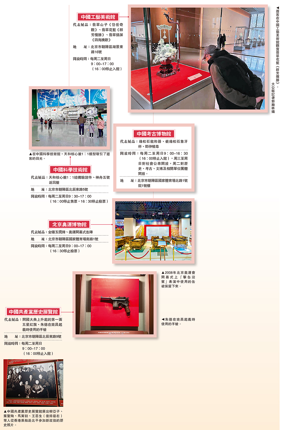 北京中軸線的北延長線上,北京奧運博物館、中國工藝美術館、中國共產黨歷史展覽館、中國科學技術館,以及近期開放的中國考古博物館這五座國家級博物館的先後落成迎客,使得「北京博物館島」正式建成。觀賞翡翠「四大國寶」,感受細膩精巧的東方韻味;造訪「天宮」模型,暢想科技與未來;打卡奧運博物館,重溫記憶中的夢想與激情……五座相互毗鄰又各具特色的展館,融會遠古與現代、傳承與創新,成為深受民眾歡迎的首都新文化地標。「漫步中軸線,打卡博物館」正成為北京市民最熱門的休閒方式。\大公報記者 孫志 任芳頡 郭瀚林