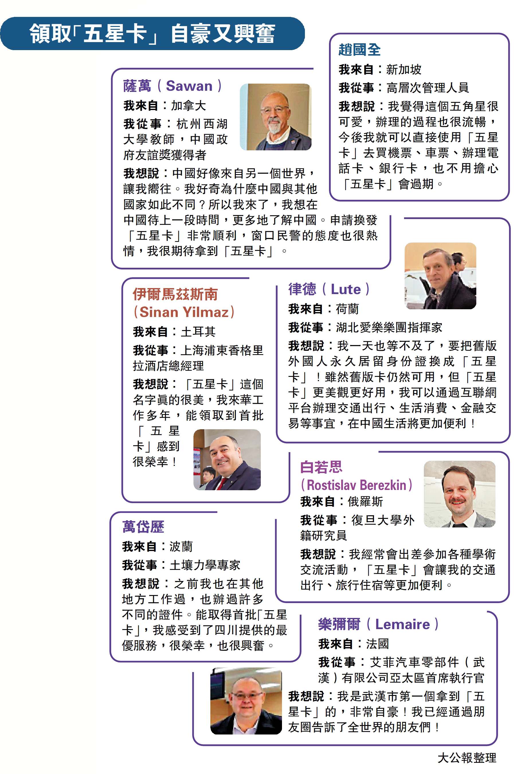 我想說:之前我也在其他地方工作過,也辦過許多不同的證件。能取得首批「五星卡」,我感受到了四川提供的最優服務,很榮幸,也很興奮。