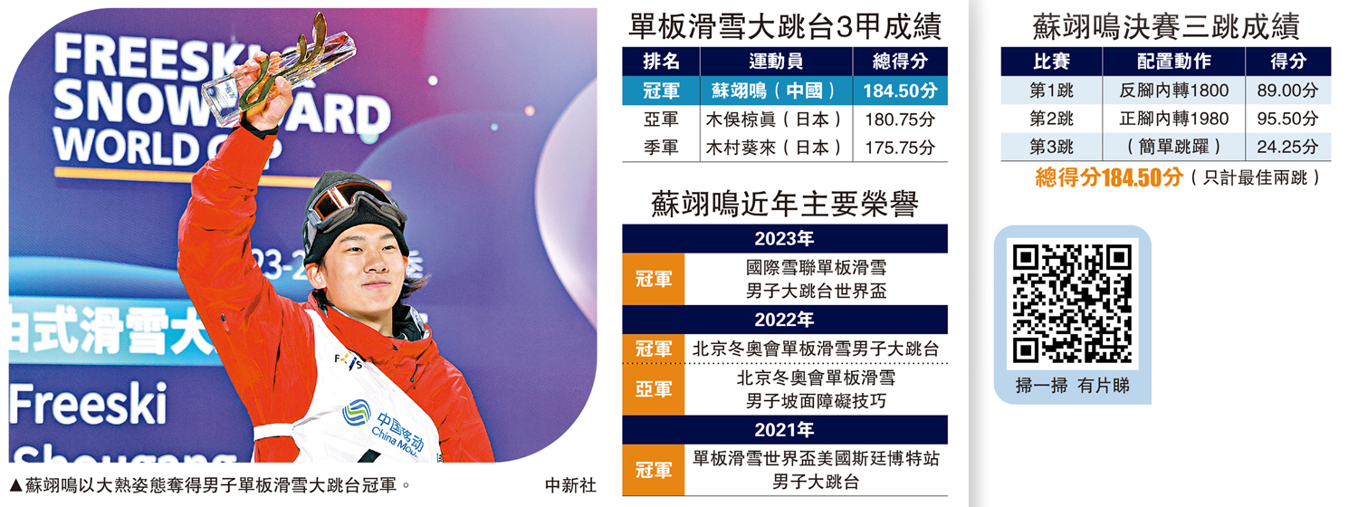 2023至2024賽季國際雪聯單板及自由式滑雪大跳台世界盃北京站,昨晚(2日)舉行決賽,中國運動員蘇翊鳴力壓一眾強手,以總分184.50分奪得男子單板冠軍。這是他在北京冬奧會獲得冠軍後首次參加國際雪聯正式賽事並奪冠。他賽後表示對於單板滑雪的熱愛未曾改變,單板滑雪沒有極限,未來將發掘更多可能性展現給大家。\大公報記者 趙一存、任芳頡
