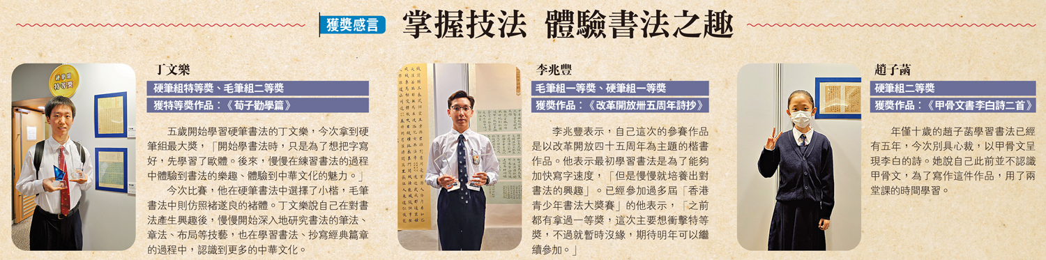 五歲開始學習硬筆書法的丁文樂,今次拿到硬筆組最大獎,「開始學書法時,只是為了想把字寫好,先學習了歐體。後來,慢慢在練習書法的過程中體驗到書法的樂趣、體驗到中華文化的魅力。」