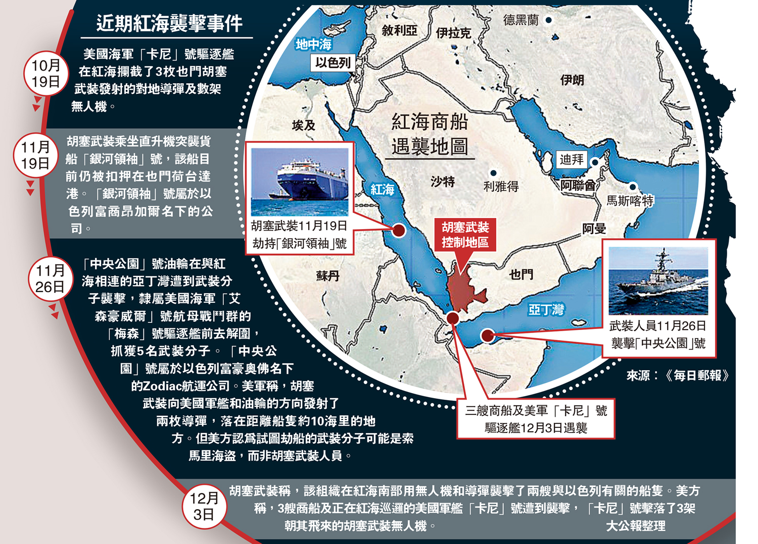 12月3日 胡塞武裝稱,該組織在紅海南部用無人機和導彈襲擊了兩艘與以色列有關的船隻。美方稱,3艘商船及正在紅海巡邏的美國軍艦「卡尼」號遭到襲擊,「卡尼」號擊落了3架朝其飛來的胡塞武裝無人機。\大公報整理