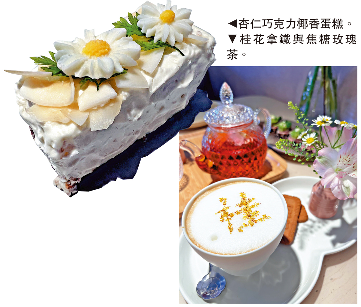 下午茶少不了飲品,喜歡咖啡的不要錯過桂花、玫瑰或茉莉拿鐵,尤其桂花拿鐵,綿滑的奶泡上灑了桂花,清香芬芳,予人中西合璧的感覺。愛喝花茶的,不妨試試美顏養生的「焦糖玫瑰茶」,用的是南非路易波士國寶茶,微紅的茶色通透明亮,喝下時有馥郁的玫瑰香,還有淡淡的焦糖甜,夢幻得如置身童話國度,在花花世界中悠然陶醉。