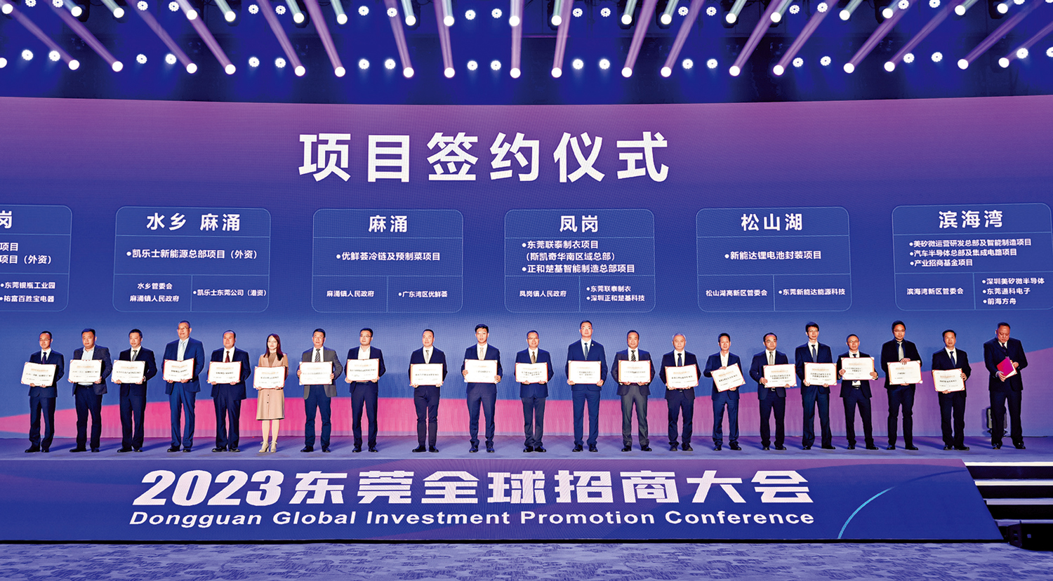 粵港澳大灣區不少城市正在年末「衝刺」招商。6日,2023東莞全球招商大會正式開幕,東莞準備好誠意滿滿的「彩禮」向全球招商,吸引芯片、新能源等產業龍頭企業前來投資。今次大會除了東莞主會場外,還在新加坡、韓國、日本、德國、美國舉辦了分會場。東莞在這次大會上設立建市以來最大規模、2000億元(人民幣,下同)高質量發展基金。同時還推出45塊總面積超1.2萬畝的產業用地,面向全球企業「掛榜招商」。大會現場簽約投資總額2180億元的產業項目,涵蓋芯片、新能源等6大產業。\大公報記者 盧靜怡東莞報道