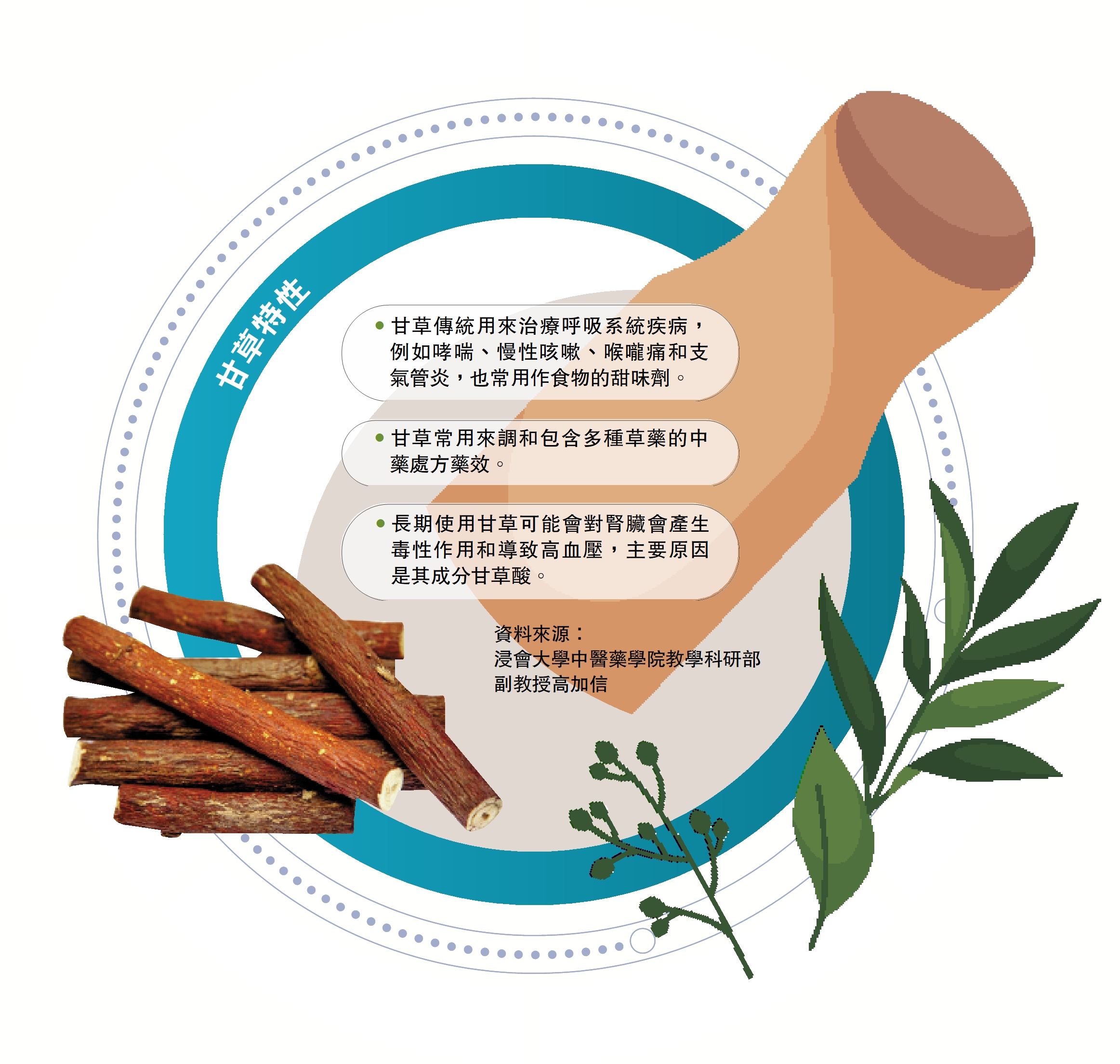 •甘草常用來調和包含多種草藥的中藥處方藥效。