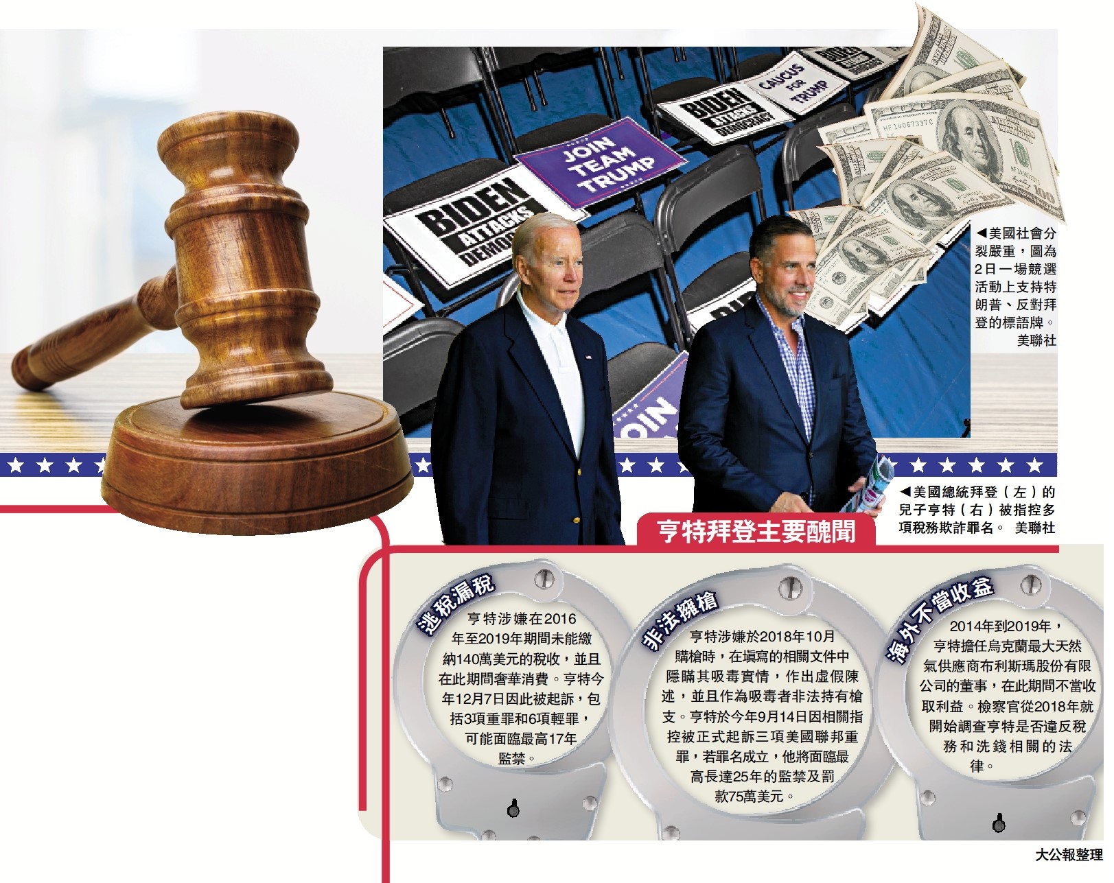 【大公報訊】綜合CNN、美聯社報道:當地時間12月7日,美國司法部對總統拜登的兒子亨特·拜登提出新的刑事指控,共有9項聯邦稅務罪,其中包括沒有申報和繳納稅款、逃稅以及提交虛假或欺詐性納稅申報單,指他未繳交至少140萬美元(約1092萬港元)的稅款。若罪成,亨特將面臨最高17年的監禁。同日,共和黨宣布計劃下周在眾議院舉行投票,以啟動針對拜登的彈劾調查。評論指出,隨着2024美國大選日子臨近,兩黨之間的鬥爭進入激烈階段,類似的政治秀也將不斷上演。