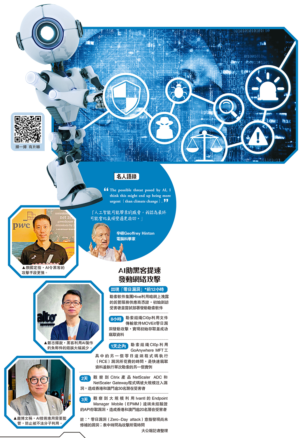 「黑客用AI做網絡攻擊的速度十分快,企業單靠人手防範,肯定會輸!」羅兵咸永道香港網絡安全及私隱服務合夥人顏國定指出,AI令黑客的攻擊手段更強,快則可於出現「零日漏洞」(即尚未修補漏洞)前12小時發動網絡攻擊,令人防不勝防。