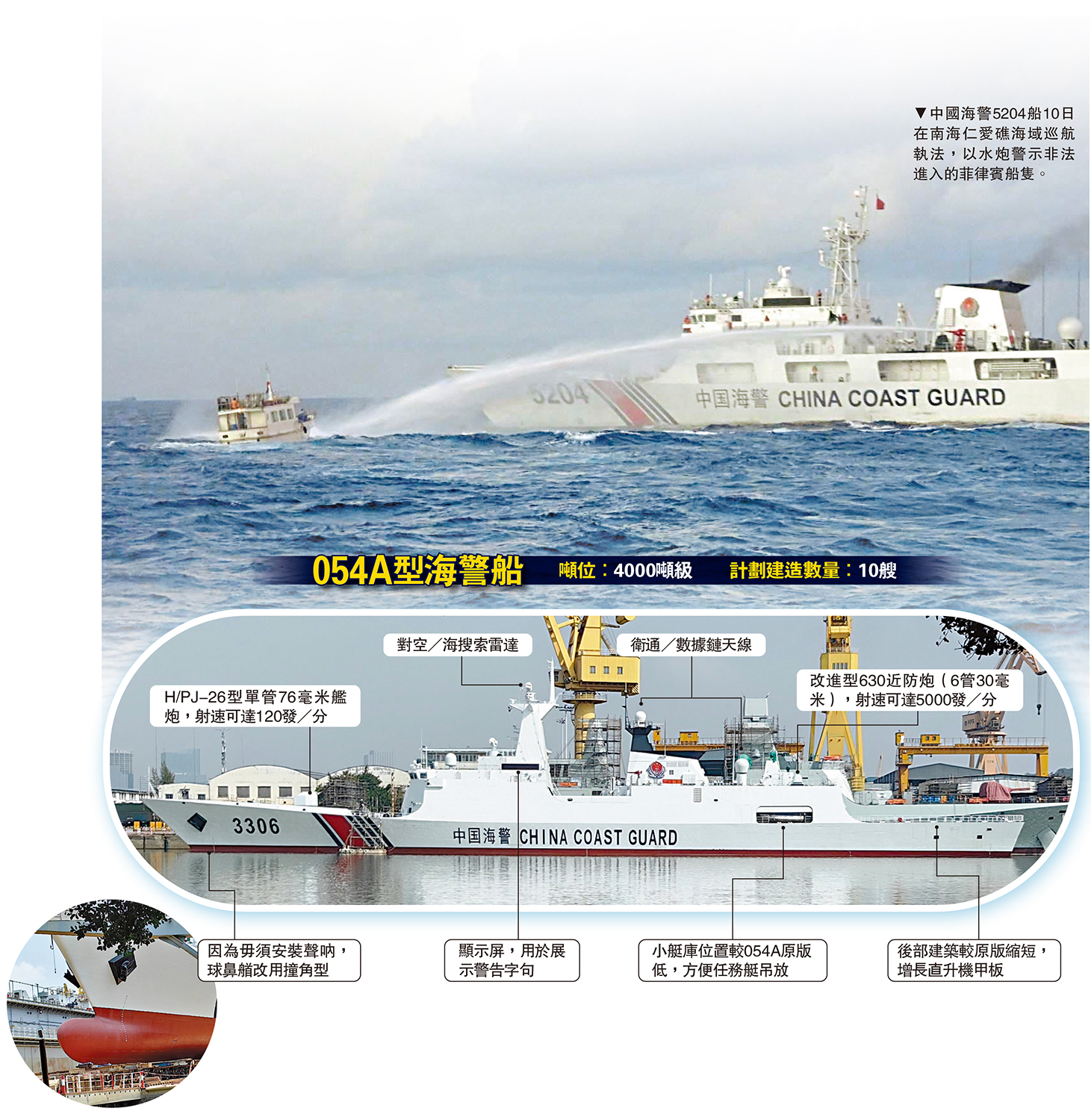 中國海警部隊最近持續在南海仁愛礁、東海釣魚島等海域開展巡航執法,對非法進入的外國船隻進行驅離。近年來,隨着一系列新型裝備投入,海警部隊裝備水平有了跨越式飛躍。除了全球第一款排水量過萬噸的海警執法船外,054A型改造海警船亦已即將交付,其裝備的76毫米主炮是護衛艦級火力,並可配備直-9A等直升機進行立體化執法執勤,將為這支堅決捍衛國家領土主權和海洋權益的「第二海軍」帶來新一輪戰力升級。\馬浩亮(文)