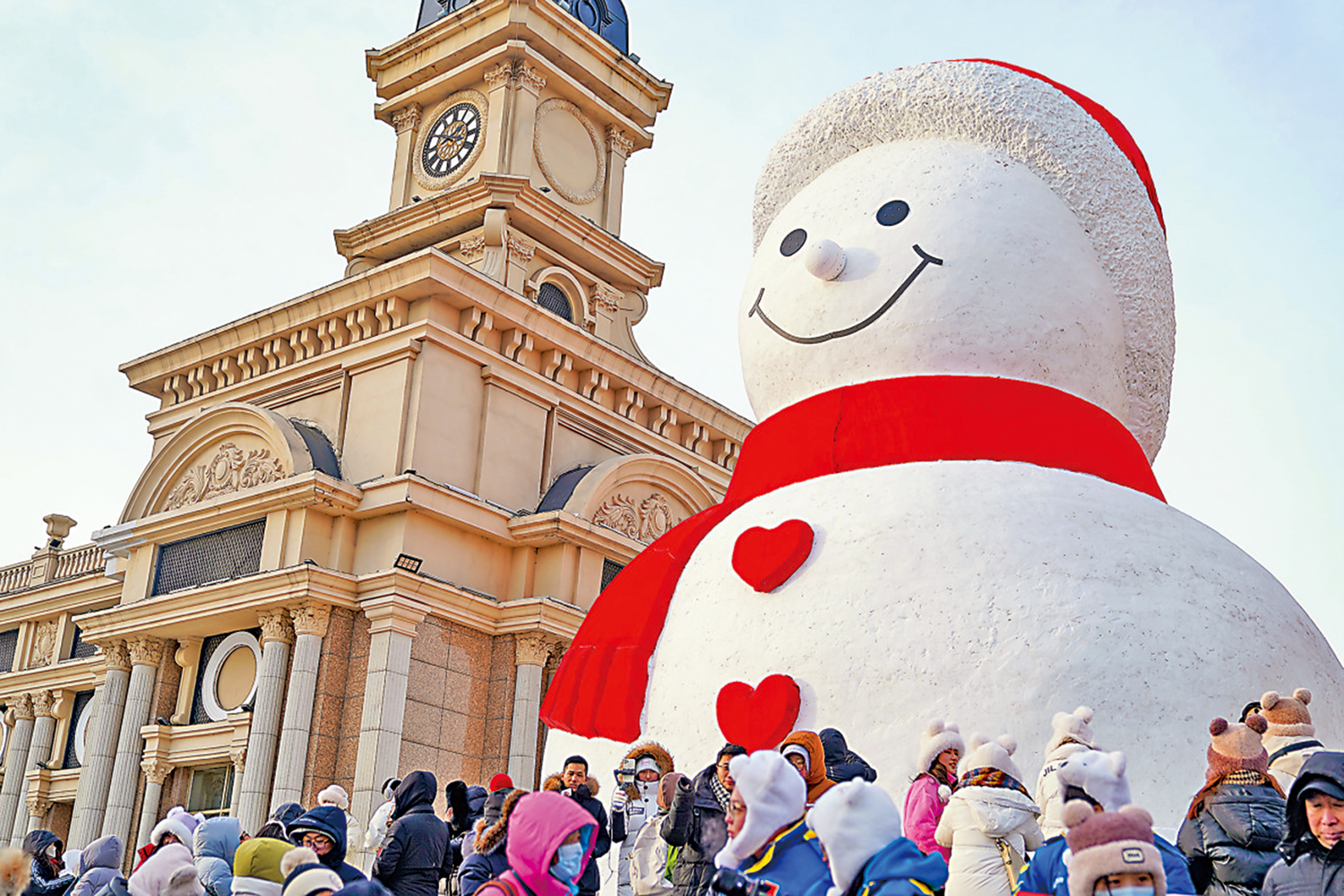 圖:頭戴紅帽子、繫着紅圍脖、胸前兩顆紅心,臉上洋溢着大大微笑的「超治癒」大雪人,在萬千網友的期盼下,回歸黑龍江哈爾濱音樂公園。今年網紅大雪人保留一貫的大型雪雕體量,總長十三米、寬十米、高十八米,用雪量約二千立方米。\中新社
