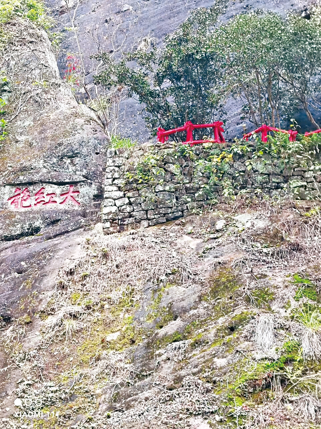 我從天心村步行進入九龍窠,沿着溪邊上山石階拾級而上,走個二十多分鐘就可見到長在半山崖的幾棵母樹。這些樹齡三百多年的母樹共存六棵,長在半山崖壁,毫不起眼。當地人用紅絲布裹着欄杆,看上去才隱約可見。母樹生長在天心九龍窠的懸崖峭壁上,兩旁岩壁矗立,日照不多,溫度適宜,終年有涓涓細泉從岩頂流下,霧狀的水粒,帶着岩頂所積蓄的養分,滋潤着半崖上的茶樹。