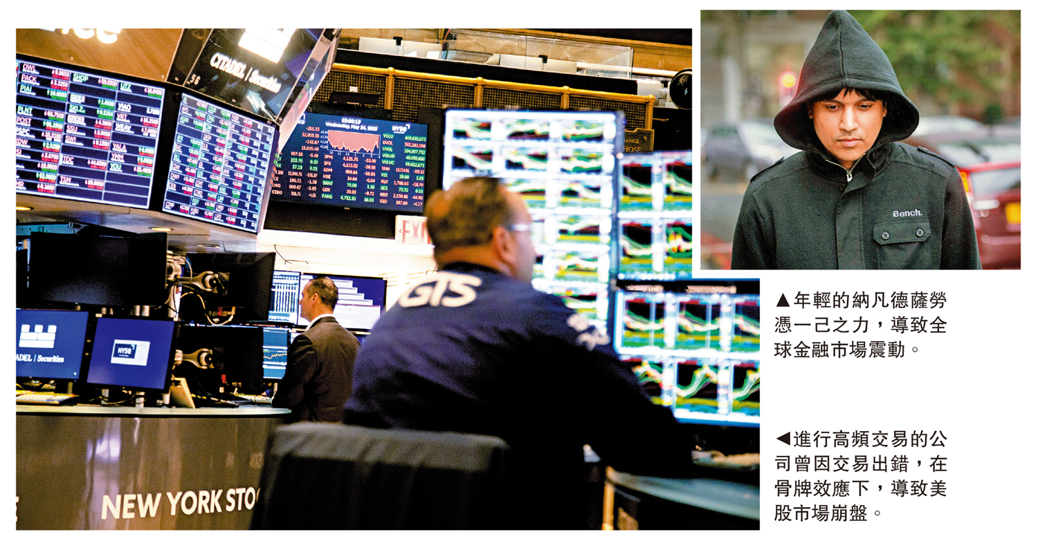 後來經過很長時間的調查才發現,原來是一個身在歐洲名為納凡德薩勞(Navinder Sarao)的年輕人,一直透過槓桿大手交易標普500指數期貨,而且他運用程式進行幌騙交易,最終令進行高頻交易的公司出錯,由於市場上的高頻交易公司都採取近似的交易策略,只要有一家公司出錯,就會出現骨牌效應,令市場崩盤,而且是迅速地崩盤。