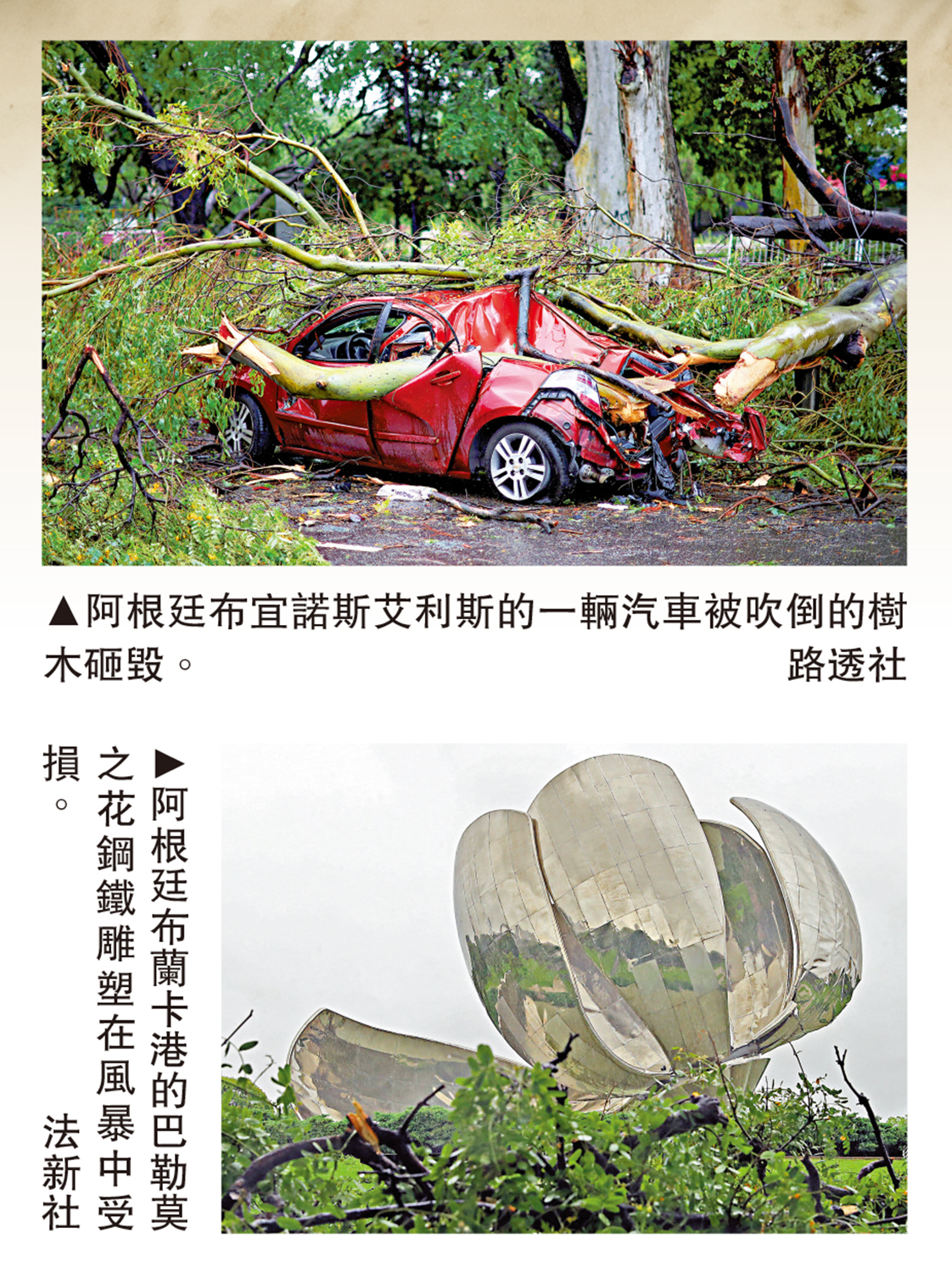 阿根廷首都布宜諾斯艾利斯17日亦受強風侵襲,風速高達每小時100公里。氣象部門已發布第二高級別的橙色警報。大雨在該市引發洪水,大量樹木和燈柱倒塌,全市逾40萬戶停電,大批航班延誤。阿根廷航空公司確認至少16架飛機受損,超過65個航班被取消。社交媒體上的視頻顯示,一架阿根廷航空飛機在停機坪上被大風吹離原位,機身偏離原地,機翼掃倒舷梯。知名觀光景點阿根廷鋼花,也因遭受狂風吹襲而斷裂。